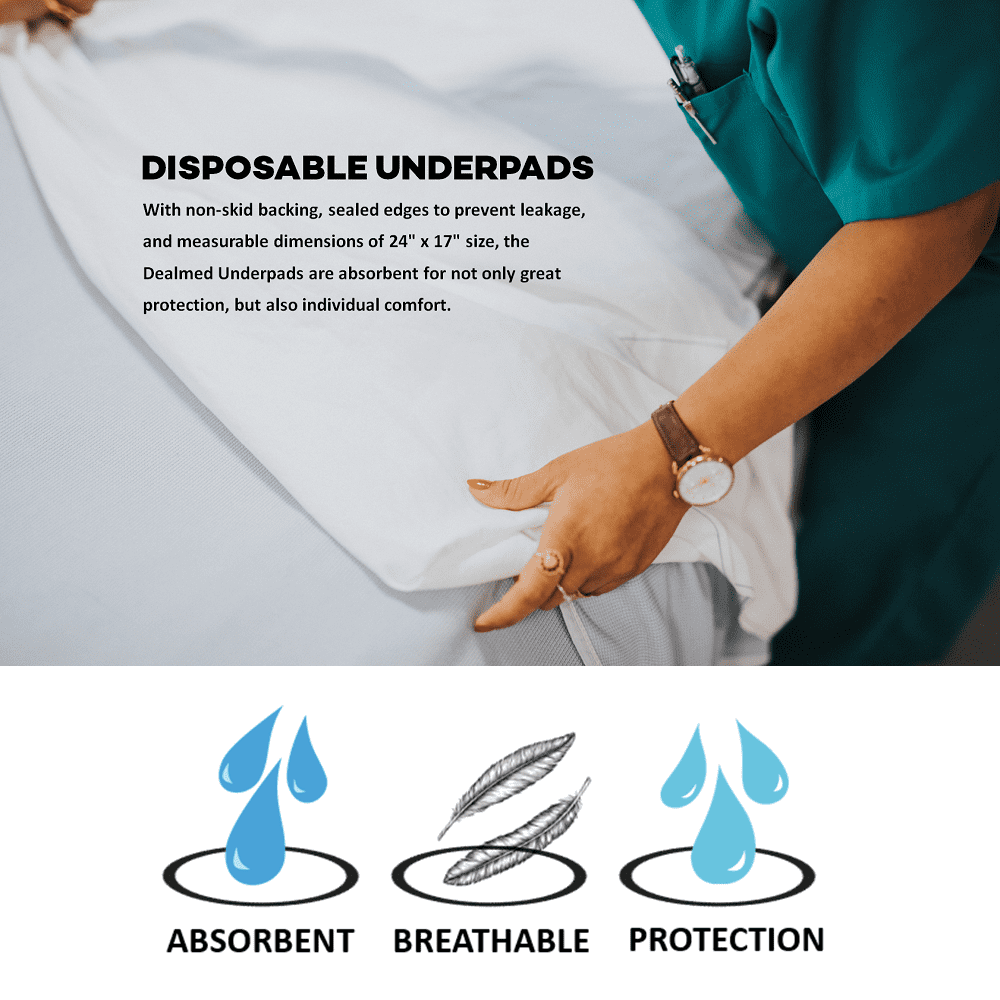 Dealmed Disposable Incontinence Non Sterile Underpads, 17′ x 24′, Tissue Fill, 100/Bag