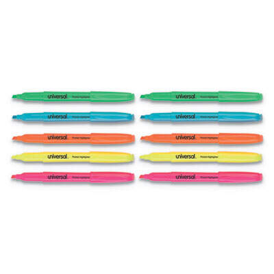 Slender barrel for comfortable grip. Chisel tip produces both broad and thin lines. Pocket clip. Color(s): Assorted; Color Family: Multicolor; Tip Type: Chisel; Assortment: 2 Fluorescent Blue; 2 Fluorescent Green; 2 Fluorescent Orange; 2 Fluorescent Pink; 4 Fluorescent Yellow.2PK Universal Pocket Clip Highlighter, Chisel Tip, Assorted Colors, 12/Set