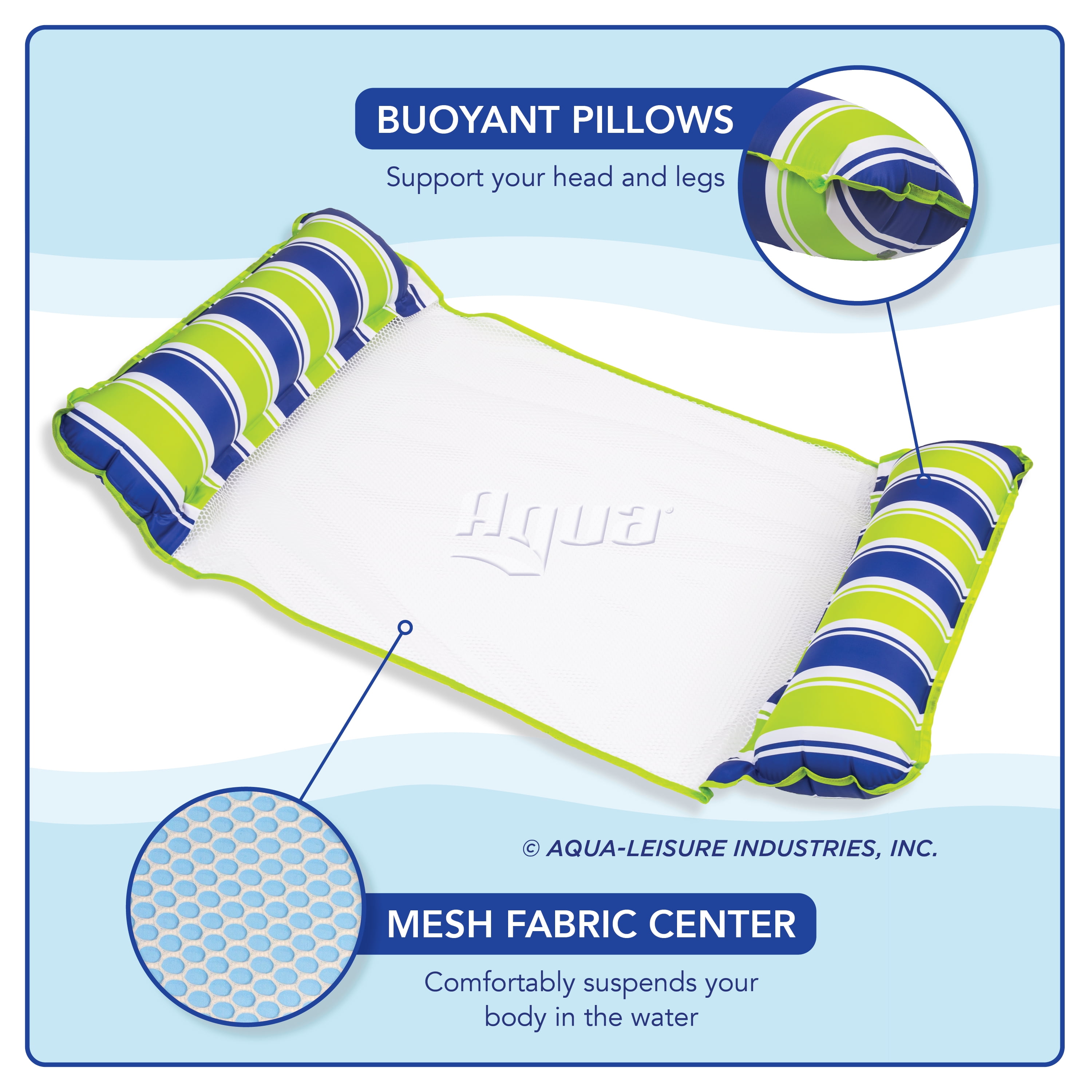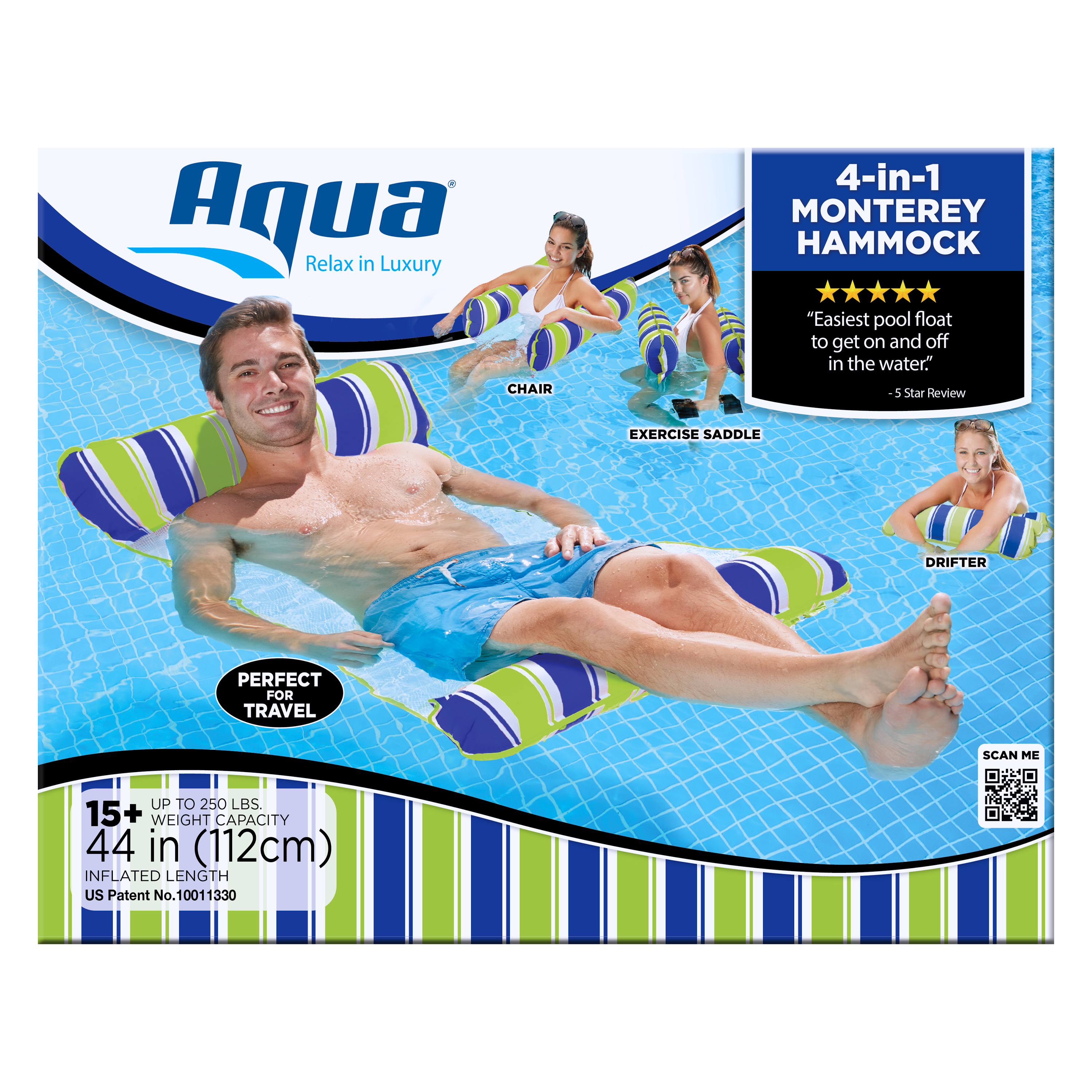 The Aqua unisex Inflatable Monterey 4-in-1 Pool Float Hammock is a unique and versatile pool float system. This pool float is designed to convert to a hammock, lounge chair, drifter and exercise saddle. This multi-striped green pool float features buoyant inflatable pillows that support the head and legs and a soft mesh center designed to suspend the body and keep you cool on the water’s surface. The multifunctional 4-in-1 Monterey Hammock is the optimal choice for all your on-the-go water adventures. When inflated, this pool float measures 44” L x 27” W. It is recommended for ages 15 and up and has a weight capacity of 250 lbs.