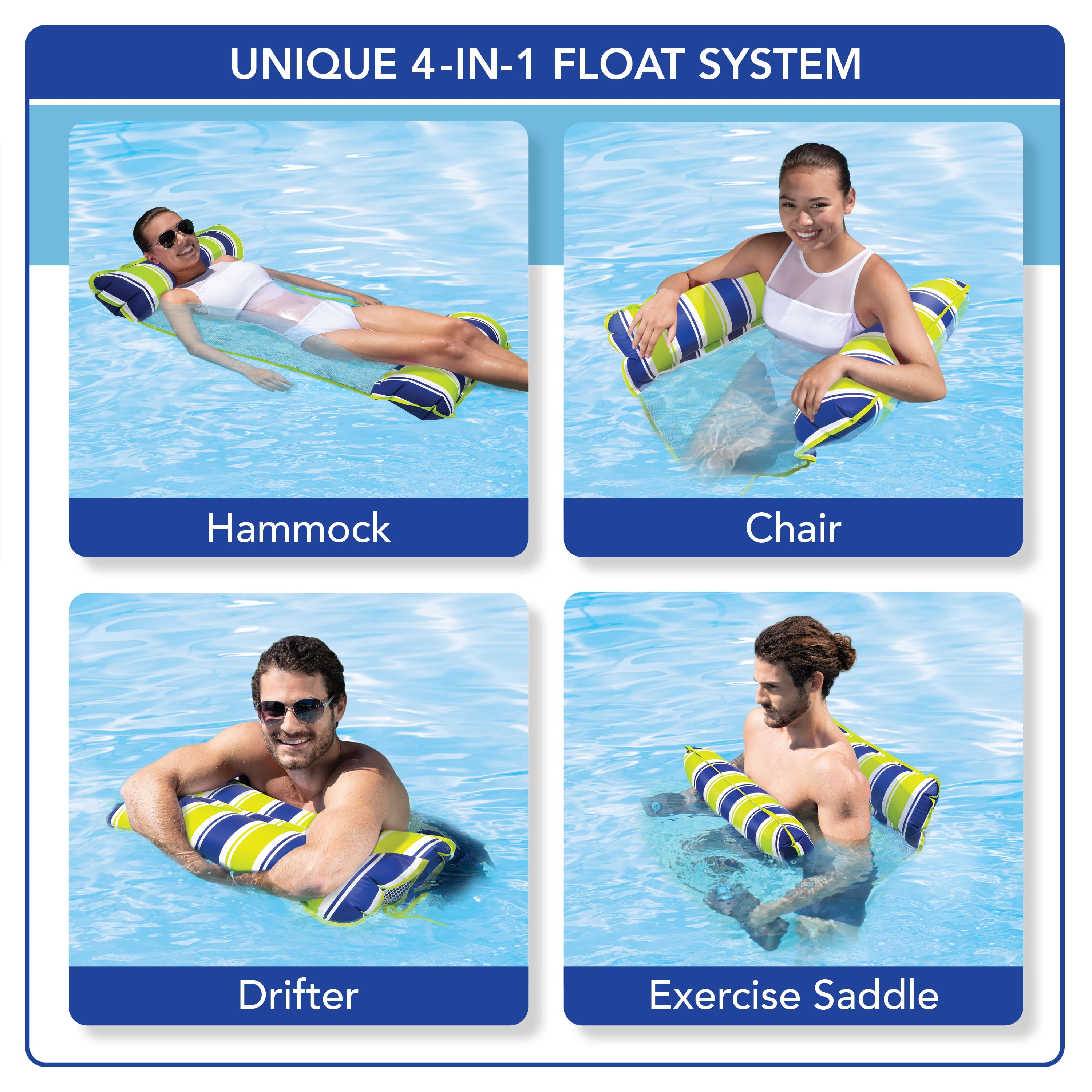 - Versatile pool float designed to convert to a hammock, lounge chair, drifter, and exercise saddle