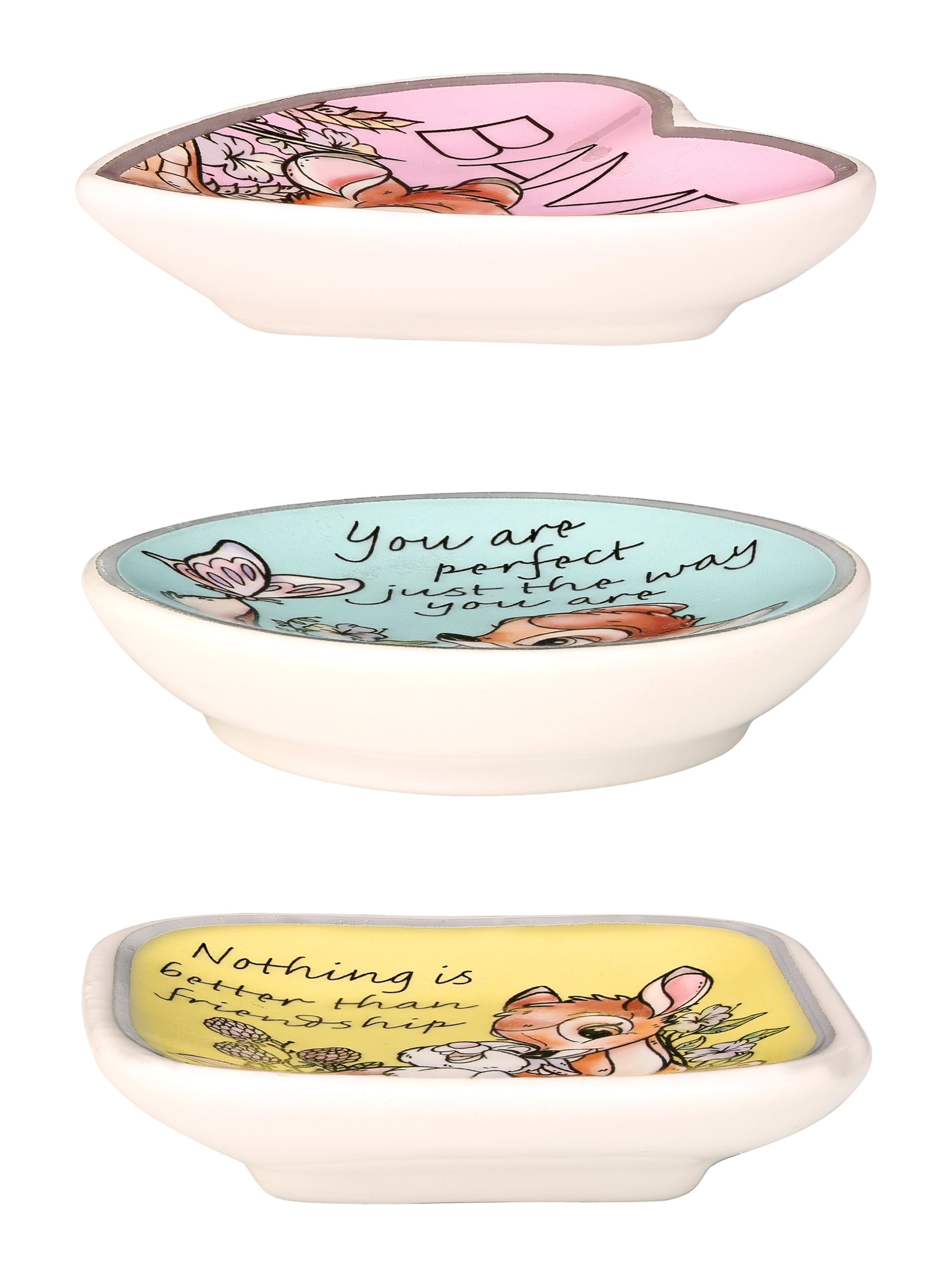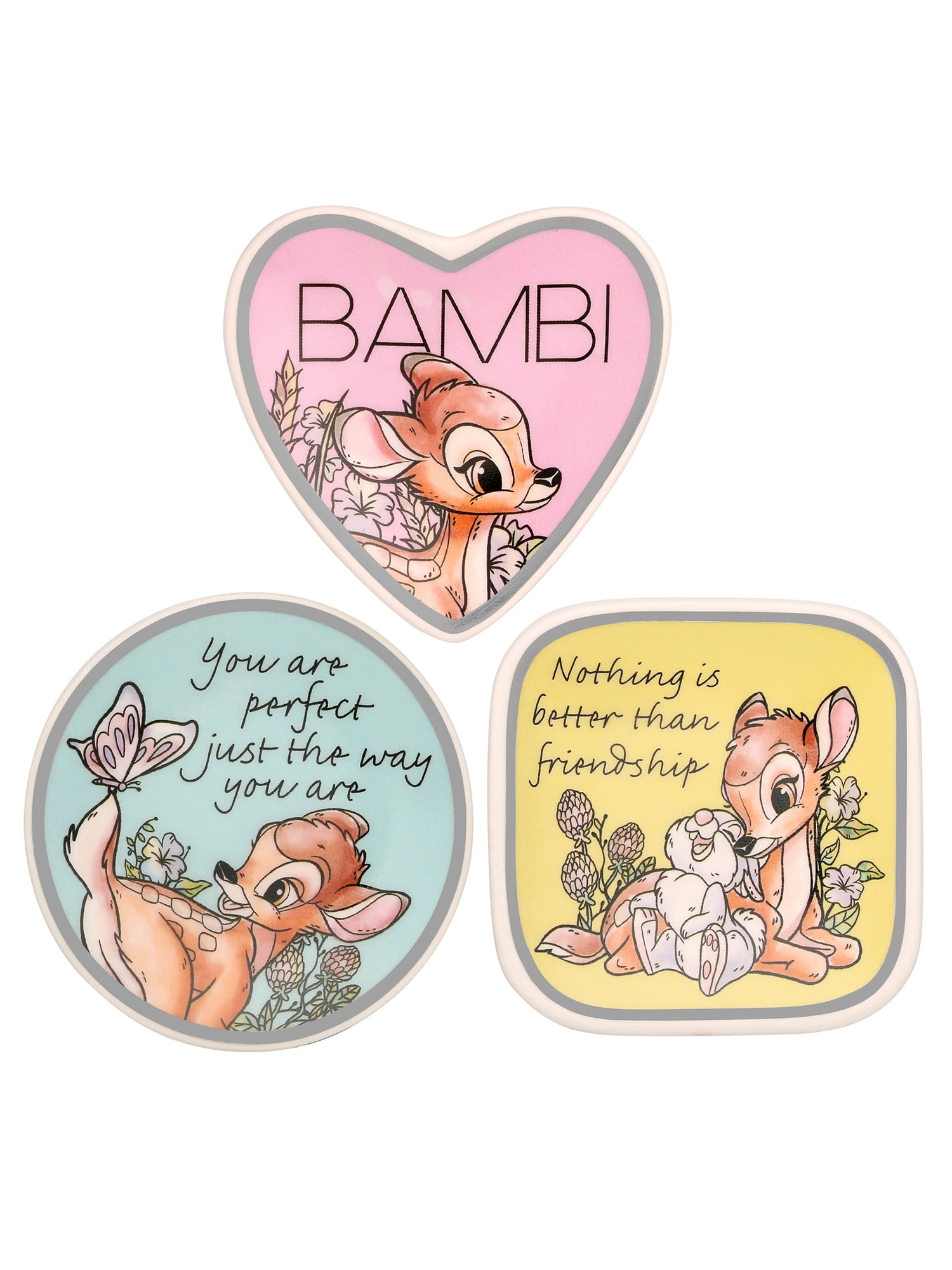 - Bring The Magic Of Disney Home; 3 piece set includes Bambi "You are perfect just the way you are" dish, "Nothing is better than friendship" dish, and a Bambi heart dish