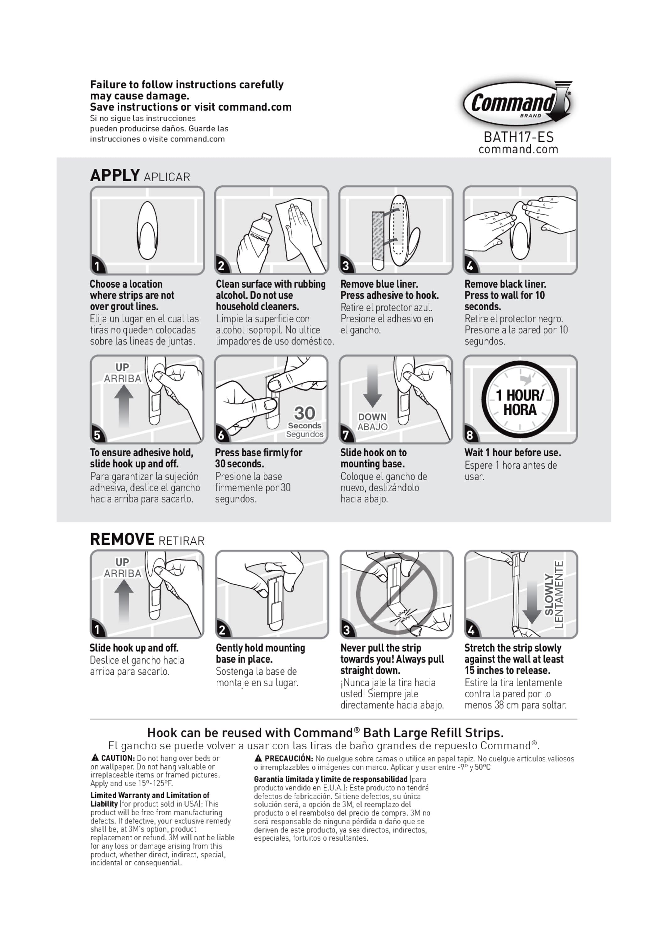 Command™ Large Towel Hook allows you to keep towels or robes off the floor, and hung up neatly so that they can dry in between uses. The hook sticks to many surfaces, including glass, mirror, tile, fiberglass, wood and painted surfaces. It is easy to apply and comes off leaving no holes, marks, sticky residue or stains. Repositioning is easy with assorted water resistant refill strips. Great for bathroom organization including guest and kids’ bathrooms, renters and dorm life!