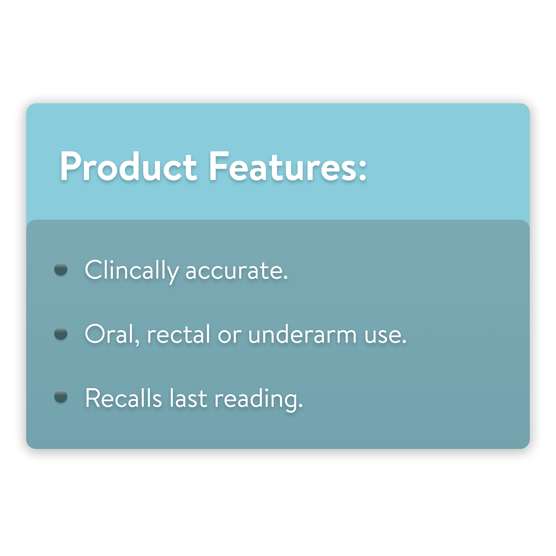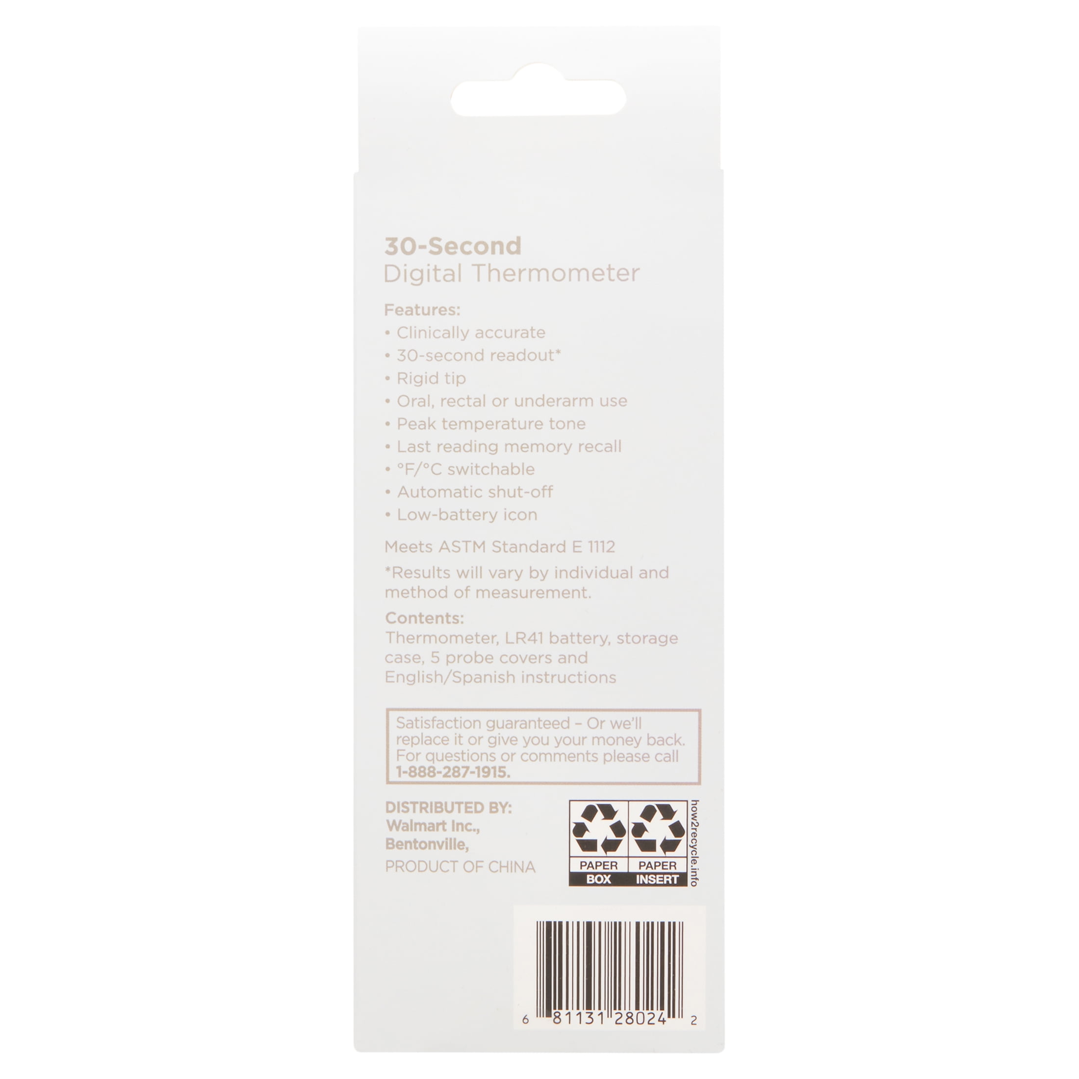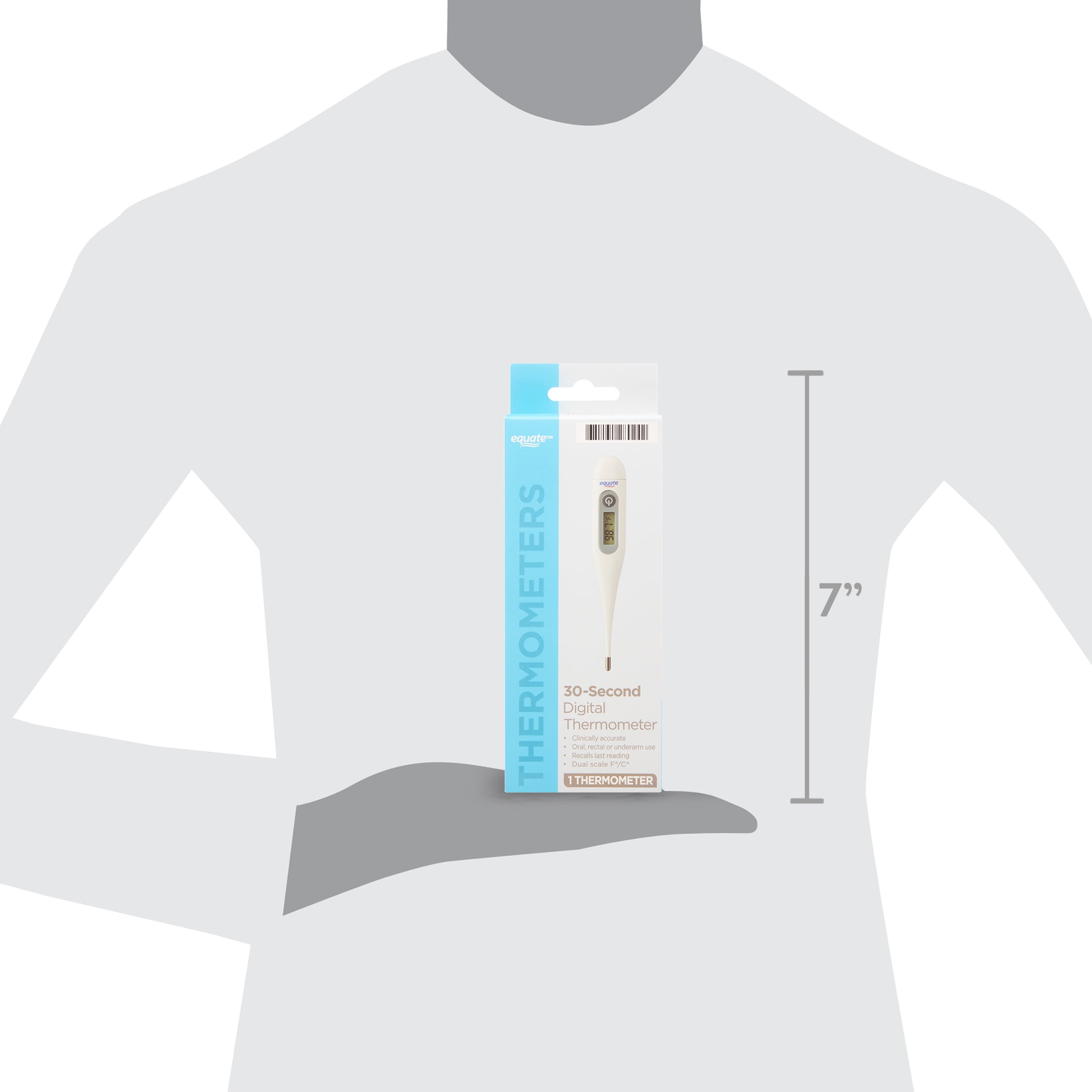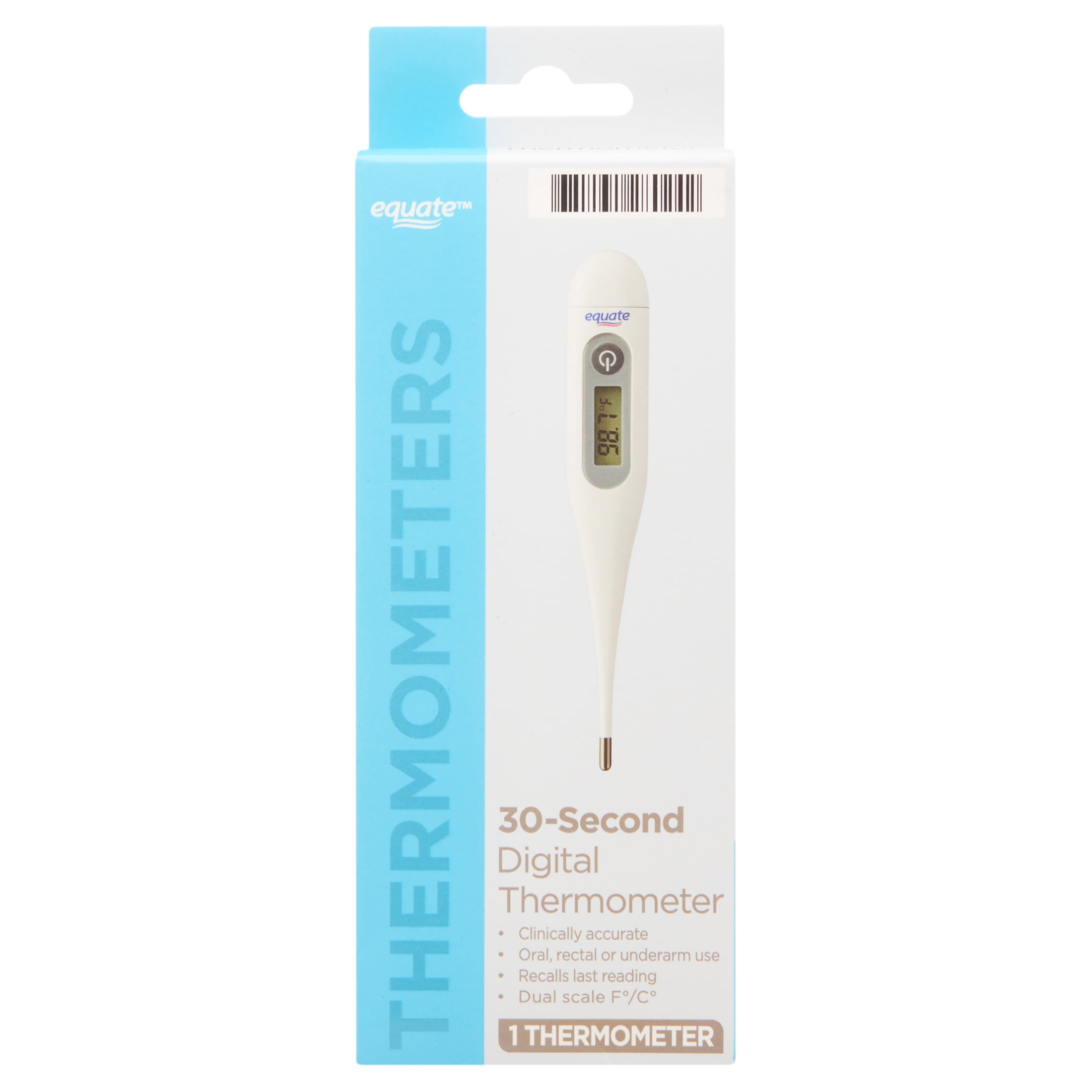 The Equate 30-Second Digital Thermometer helps you take care of your loved ones when they need it the most. This clinically accurate digital thermometer has a rigid tip that can be used for oral, rectal, or underarm use. With the ability to recall your last reading, a peak temperature tone, and an automatic shut-off, this thermometer makes temperature taking a quick and convenient task. Every package includes our digital thermometer, one LR41 battery, one storage case, five probe covers, and instructions in both English and Spanish. When a loved one is feeling under the weather, turn to our Equate 30-Second Digital Thermometer to provide them with the care they need.