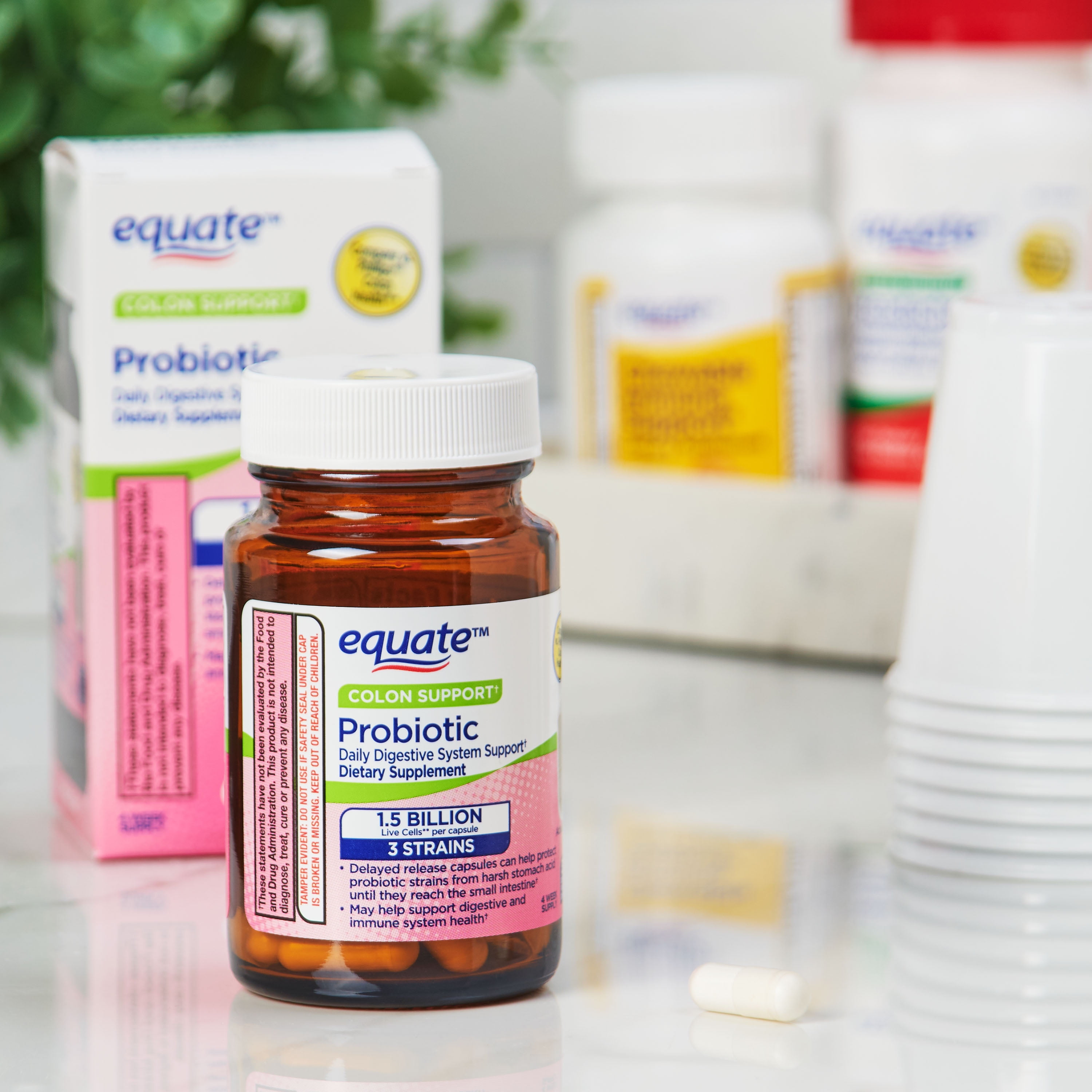 One Equate Colon Support Probiotic Delayed-Release Capsule may help maintain digestive system balance, may help promote digestive health, and may support a healthy immune system.ƚ Equate Colon Support Probiotic Delayed-Release Capsules are formulated with three beneficial probiotic strains that deliver 1.5 billion live cells in each capsule.**