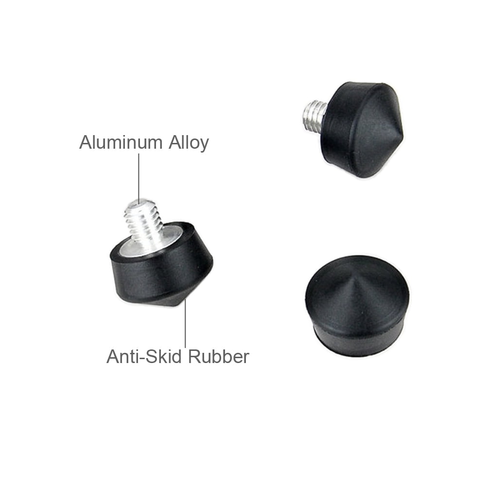 The excellent anti-skid foot spikes are practical tripod/monopod accessory designed for stable indoor & outdoor shooting.The rubber replacement foot spikes can be screwed into the threaded 3/8"-16 sockets at the ends of the tripod legs.The rubber feet prevent the tripod from slipping on smooth surfaces and provide extra stability on uneven terrain.The universal 3/8"-16 stud at the top allows you to use them with any brand that uses standard 3/8"-16 thread.Compatible with standard 3/8 inch threaded tripod foot and monopod foot, such as Andoer, Benro, Gitzo, Induro, Kingjoy, Manfrotto, Weifeng, RRS, etc.They’re an ideal way to keep your tripod stable when you’re shooting on smooth surfaces, uneven terrain. They’re also useful on carpeting.Material: Aluminum Alloy + RubberWeight: ~ 18g / 1 pcTotal length: ~ 40mmDiameter: ~ 30mmWork load: 6-10 KGContent: 3x Rubber Foot Spike