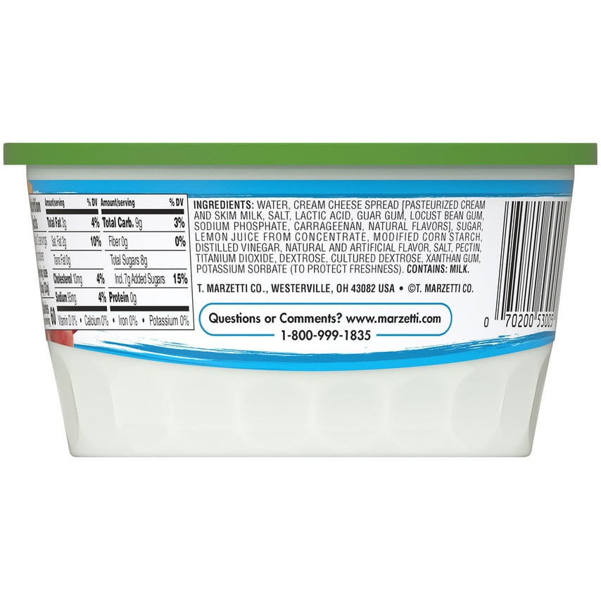 Give guests a delicious dip they can enjoy with cut, fresh fruit with Marzetti Cream Cheese Fruit Dip. This delectable dip combines the mild and tangy delicious flavor of cream cheese and adds the sweetness of real sugar, no high fructose corn syrup, for a masterfully blended dip that elevates and complements all types of fruit. From citrus to berries, each bite offers a tasty treat that will elevate party platters and appetizer tables. This 13.5 oz Marzetti cream cheese dip comes in a resealable container to help maximize freshness in between celebrations and snacks. This yummy dip will appeal to the whole family, including picky kid palates.