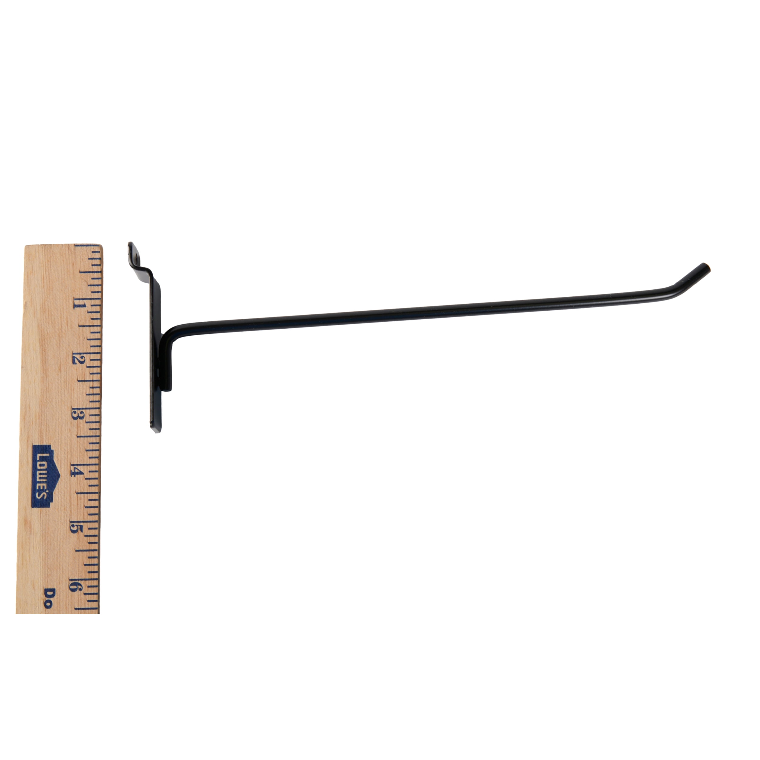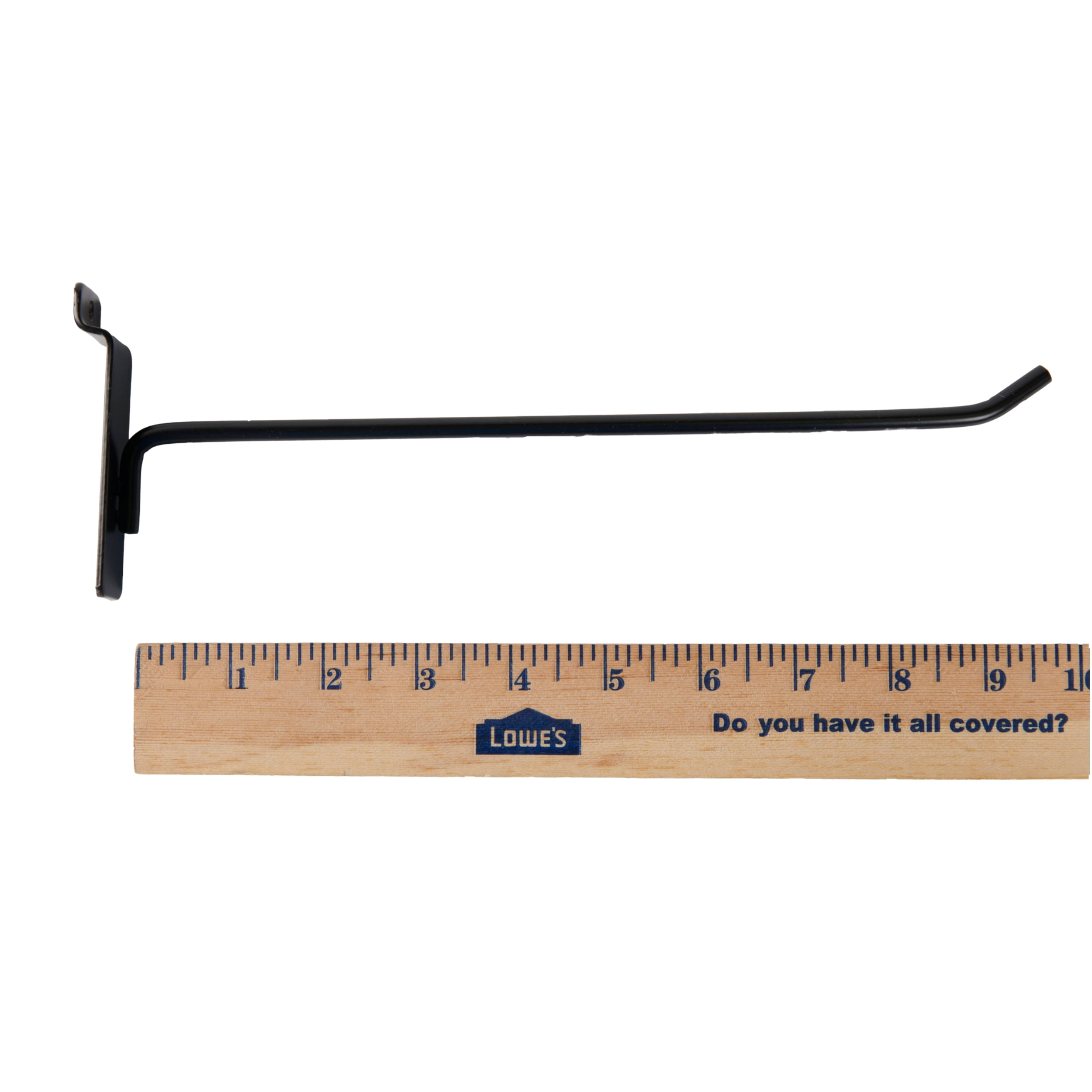 The Black 10" Slatwall Hook is perfect for holding merchandise in your displays and maximizing the valuable wall space that you will need to keep your displays neat and orderly. The 10" reach makes the hook great for any size items that you want to display.COLOR: A durable steel peg hook in a stylist black powder coat finish.