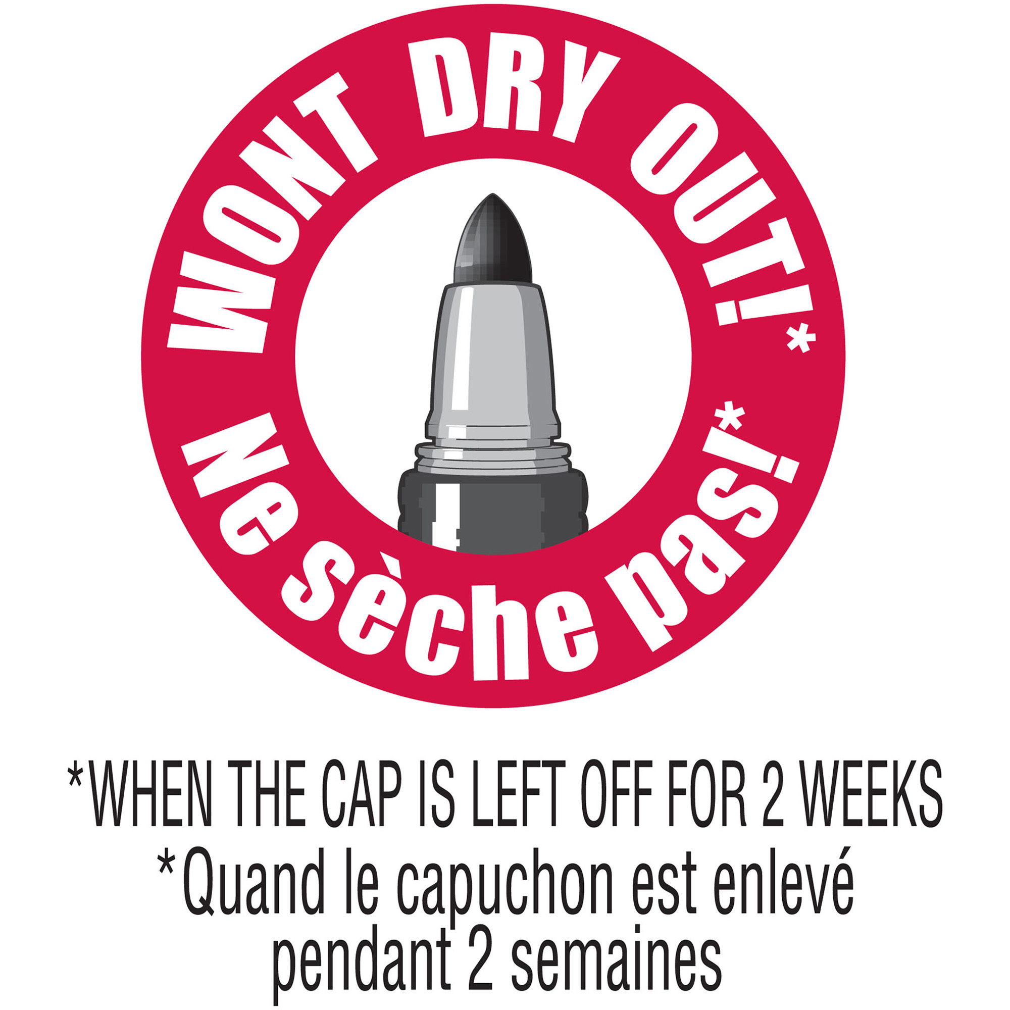 Permanent markers with a fine point are permanent on most hard-to-mark surfaces. Silver barrel and a textured rubber grip deliver comfort and control. True-to-form fine tip provides smooth ink flow with fade-resistant, acid-free, bright, vivid colors. Quick-drying ink marks on most anything, including glass, metal, plastic, photos, foil-coated papers, oily and damp surfaces. Ink won’t dry out when cap is left off for two weeks. Cap color indicates ink color.