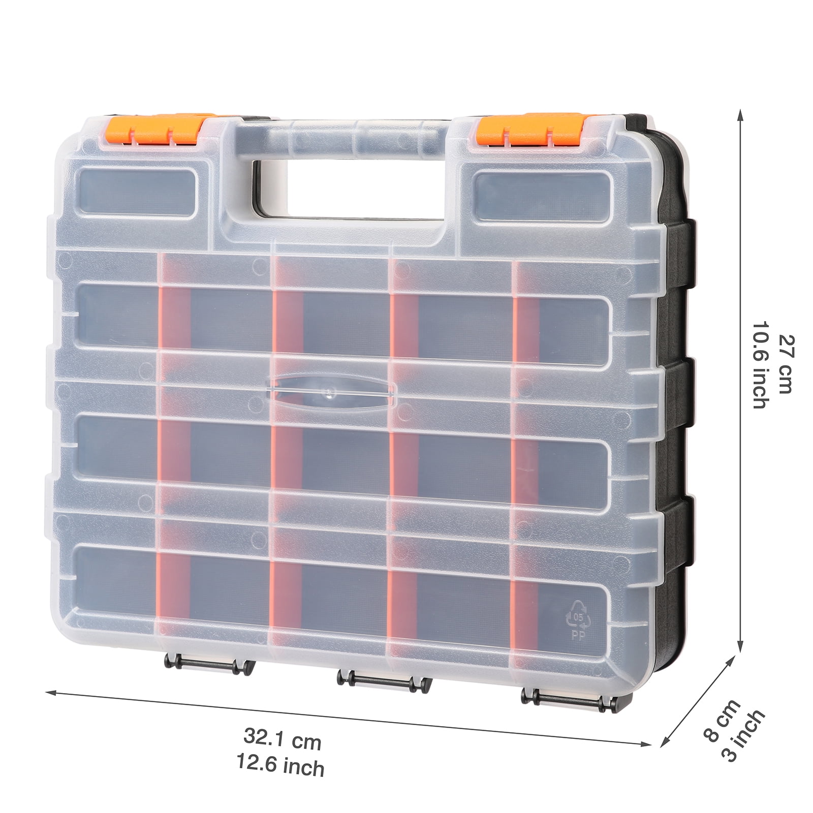 This CASOMAN Double Side Tool Organizer, professional hardware box Storage with 34-compartment, Excellent for Screws,Nuts,Small Parts,It is made of durable and heavy duty plastic material. Double side design with professional looking. An attractive color combination in black body, clear lids, orange closure and divider pieces.