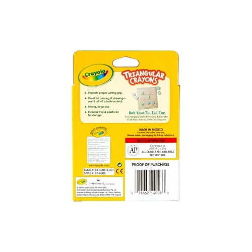 Guides little fingers toward a writing grip. Washable Triangular Crayons are the right shape to help guide toddlers fingers into the tripod position for more purposeful and controlled drawing. As children approach 24 months, they begin to hold crayons with the thumb and two fingers. Their scribbles now look like the zigzags or tighter, more controlled circles. The tripod grip is important for developing later writing skills. Crayola Beginnings Washable Triangular Crayons are designed to easily wash off walls with just warm water and a sponge.