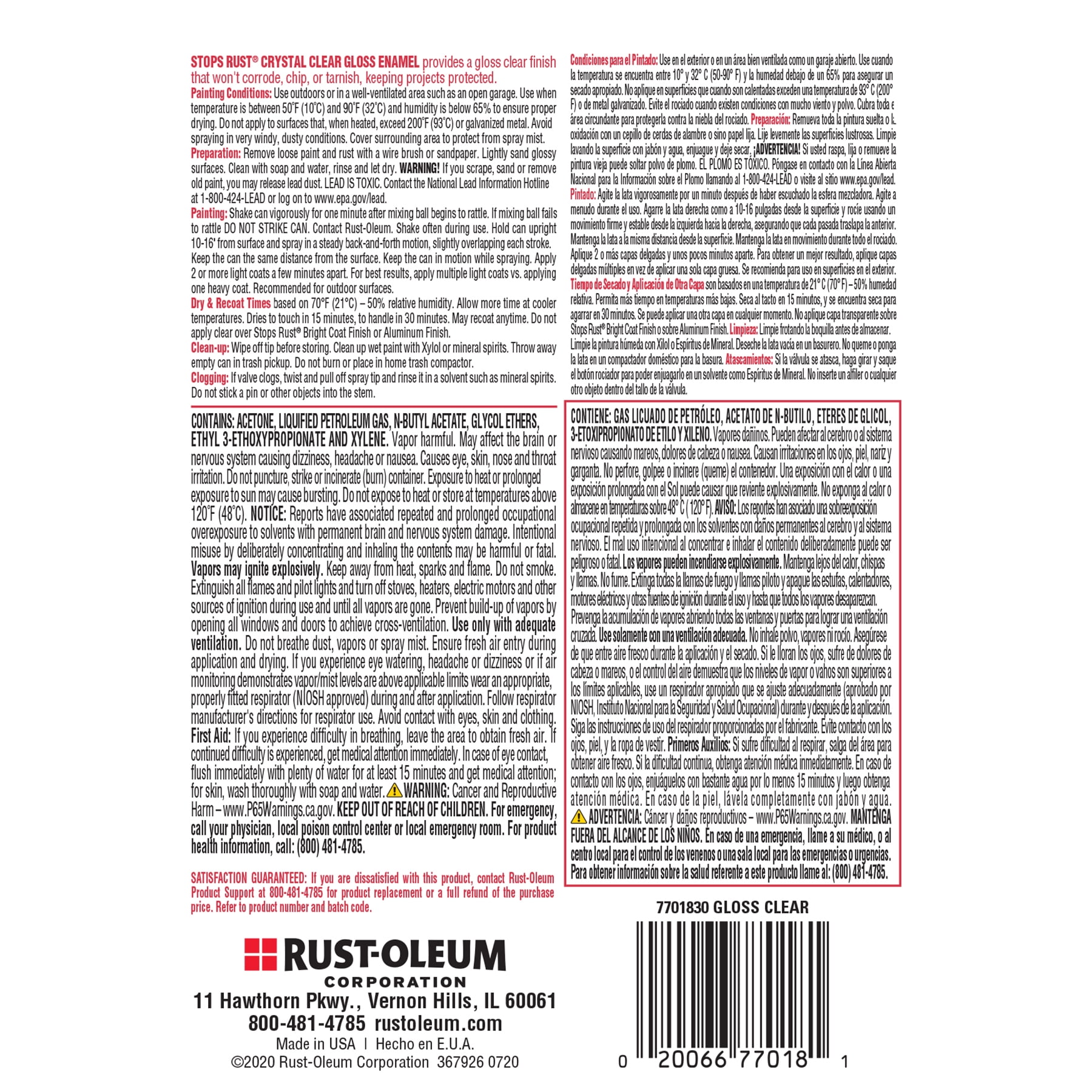 Crystal Clear, Rust-Oleum Stops Rust Gloss Protective Enamel Spray Paint-7701830, 12 oz: Provide a durable protective coating for all your indoor and outdoor projects. The rust-preventative formula offers excellent resistance to abrasion, fading, chipping and dulling. Paint dries to the touch in 2-4 hours and applies easily; covering up to 15 square feet. Specially designed comfort spray tip reduces finger fatigue and sprays from any angle – even upside down for hard to reach areas.