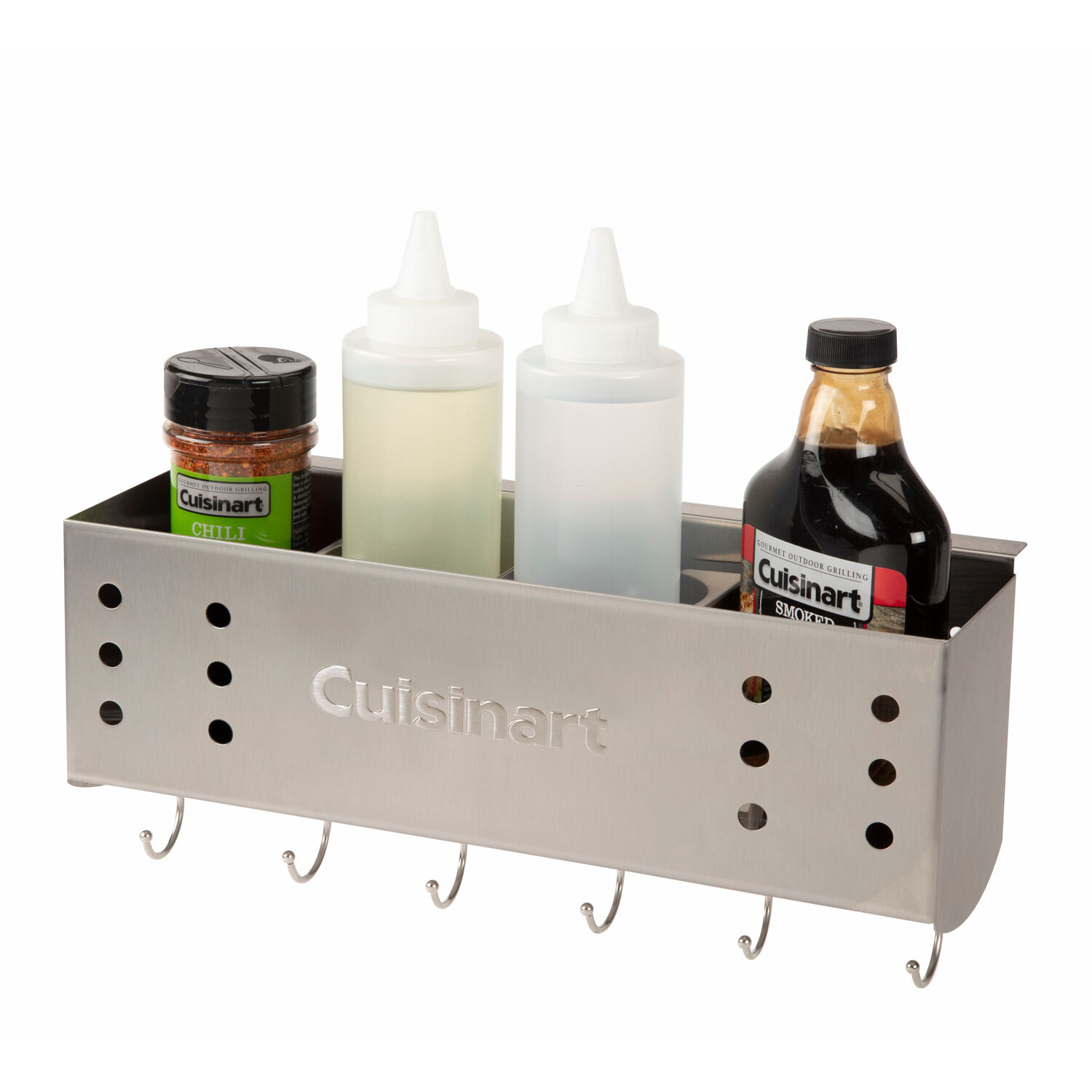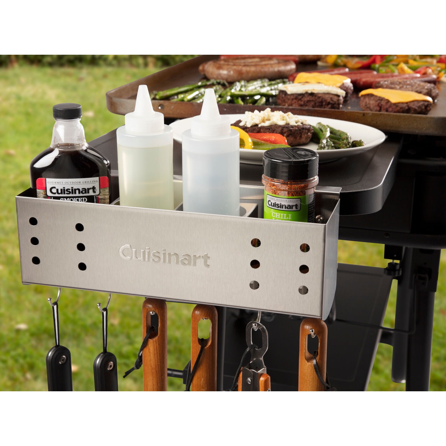 The Cuisinart stainless steel caddy will help clean up your side table of any clutter, while keeping necessary tools close by. No need to drill into your side table, the compatible clamp system make the assembly process super easy and will fit on most side tables of grills and griddles! This caddy also comes with a removable condiment holder (great for squeeze bottles) and 3 C-hooks that will hold 6 tools. This is a great accessory for any griller or gridler!