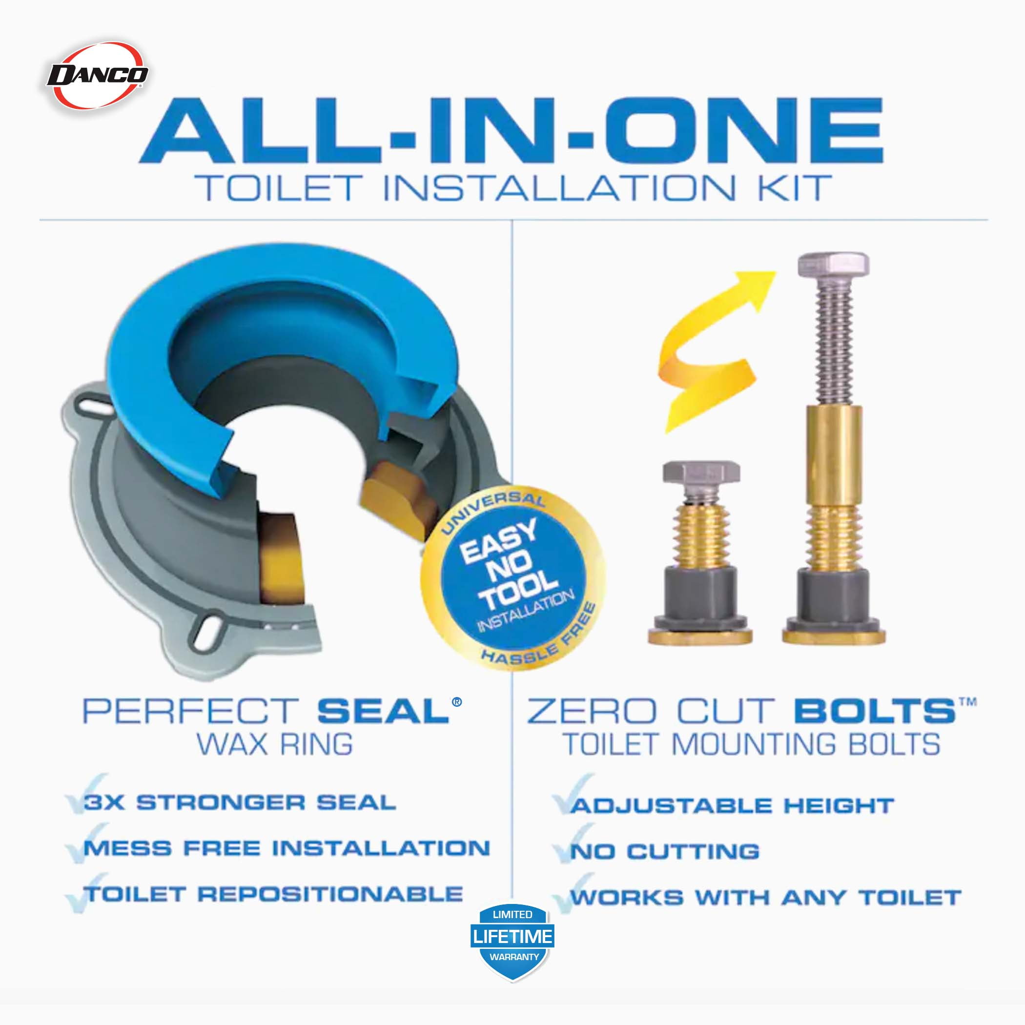 The All-In-One Toilet Installation Kit includes the Perfect Seal Wax Ring and Zero Cut Toilet Bolts, making a toilet installation project a one-person job. The Perfect Seal is a universal toilet wax ring that works with most drain sizes and flange depths. Whether the flange is ½ inch above the floor or 1-1/2 inches below, the Perfect Seal guarantees a perfect seal every time. The patented design combines specially designed rubber gaskets with encapsulated wax that forms a seal three times stronger than a wax ring without the mess and allows the toilet to be repositioned if needed during installation. The Zero Cut Bolts eliminate the hassle of typical toilet bolts that are too long, wobble and are difficult to line up when setting the toilet. The universal bolts work with flanges above or below the floor and can be adjusted in height from one inch to three inches without cutting, removing the threat of chipping or cracking the toilet due to over tightening. The All-In-One Toilet Installation Kit makes toilet installation easy.