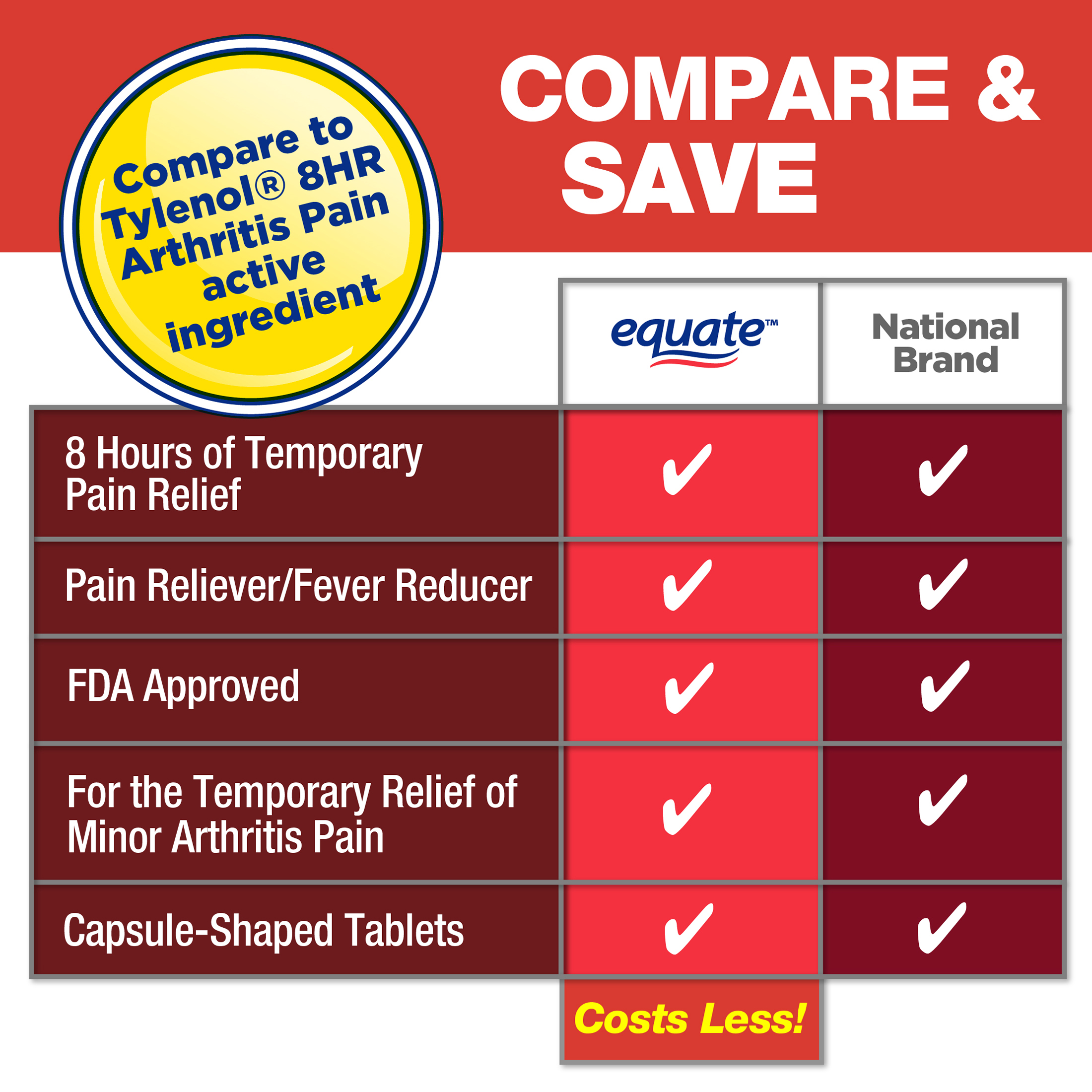 Compare to the active ingredient of Tylenol 8HR Arthritis Pain. Don’t let arthritis pain keep you from doing what you love. Equate Acetaminophen Extended-Release Tablets, 650 mg is a pain reliever/fever reducer that provides temporary relief of minor arthritis pain for up to 8 hours. It also helps to temporarily reduce fever and relieve minor aches and pains due to the common cold, premenstrual and menstrual cramps, headache, backache, toothache and other muscular aches. Effective for minor arthritis pain. Contains 650 mg of acetaminophen in each extended-release tablet. For adults 18 years and older. This product is free of aspirin and gluten.