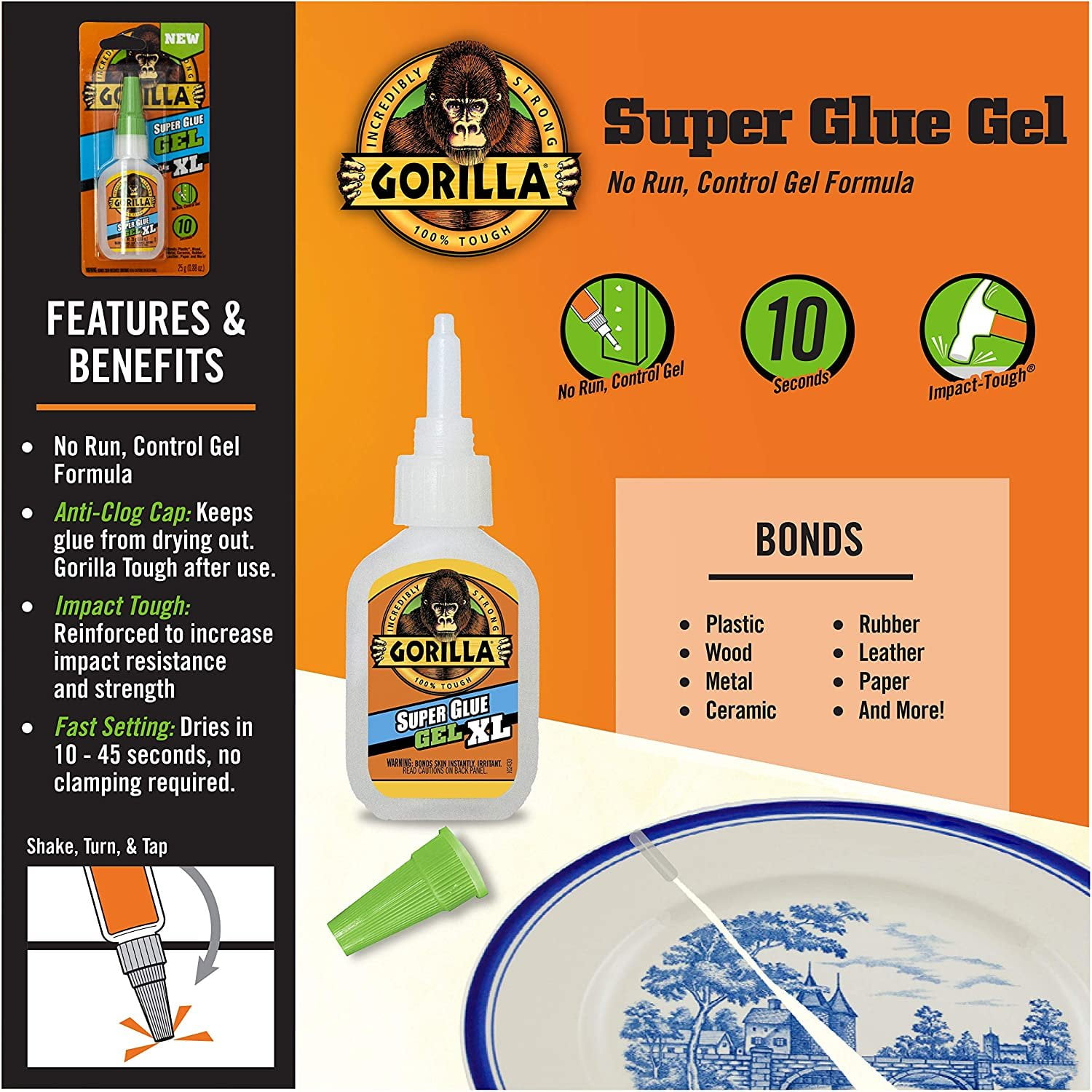Gorilla super glue gel is an easy-to-use, thicker and more controlled formula great for multiple surfaces and vertical applications. In addition to its high performance formula, we’ve added an anti-clog cap with a metal pin inside to ensure an airtight seal for maximum reusability. Its Gorilla tough, every time. Not recommended for use on polyethylene or polypropylene plastic.