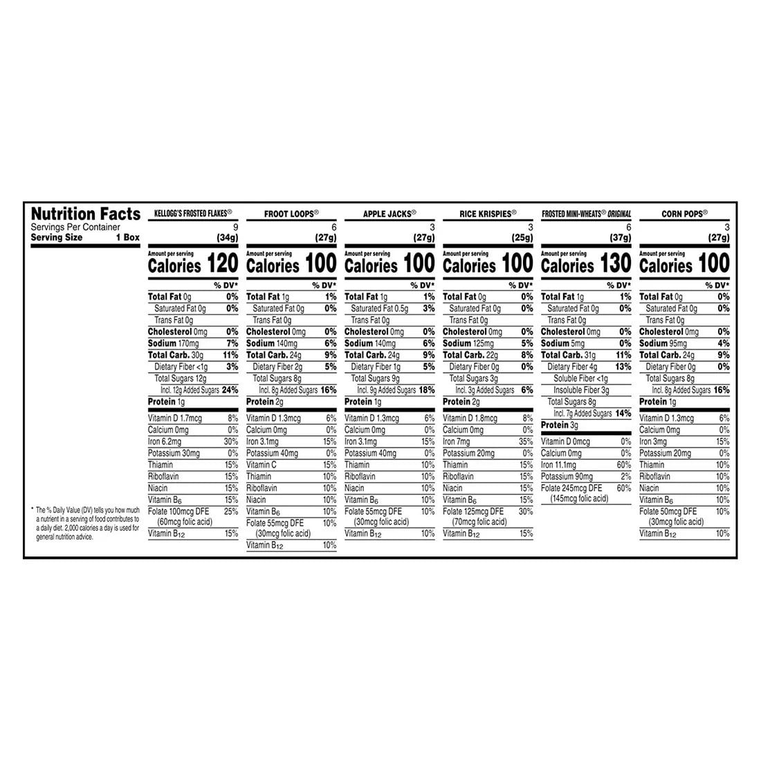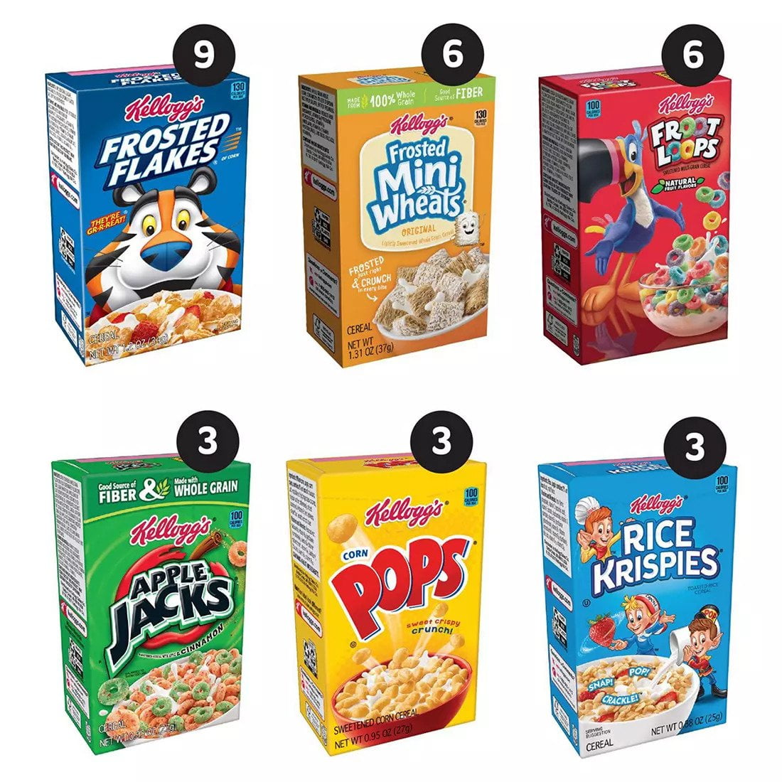 Kellogg’s Cereal 30 Box Variety Pack 32.73 Total Ounces. A sweet, crispy, and crunchy way to start your day, this Kellogg’s Assortment Pack offers six family-favorite cereals that make a delicious addition to any breakfast spread. There’s something for everyone in this variety pack, which includes Kellogg’s Frosted Flakes, Frosted Mini-Wheats, Froot Loops, Corn Pops, and Rice Krispies. Each cereal pairs famously with morning sides such as fresh fruit, yogurt, eggs, and breakfast sausages or bacon. Individually sized and conveniently packaged, these mini-boxes are an ideal companion for lunchboxes, after-school snacks, and other busy, on-the-go moments. Toss one in your tote bag, your kid’s backpack, or take them with in the car for a quick bite to eat at the game, on a hike, at the beach, or at the park.3 – Mini Wheats 3 – Rice Krispies 4 – Raisin Bran 4 – Apple Jacks 4 – Froot Loops 3 – Corn Flakes Original 3 – Corn Pops 6 – Frosted Flakes