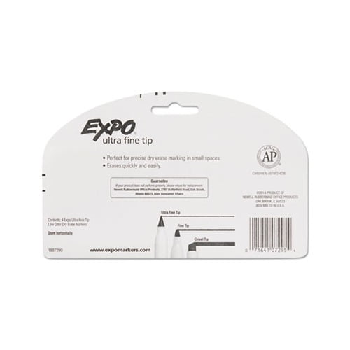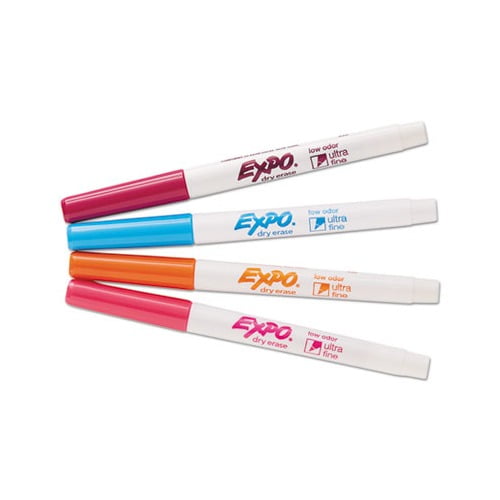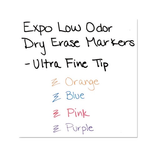 Markers feature bold ink that’s easy to see from a distance and provide consistent color quality. These Expo dry erase markers erase cleanly and easily from whiteboards and other non-porous surfaces with a dry cloth or Expo eraser. The dry erase marker ink is specially formulated to be low-odor, making it perfect for use in classrooms, offices and homes. Use your Expo whiteboard markers to track, schedule and present. Marker Ink Type: Dry Erase Marker Tip Type: Needle Marker Tip Size text: Extra-Fine Marker Colors: Assorted.