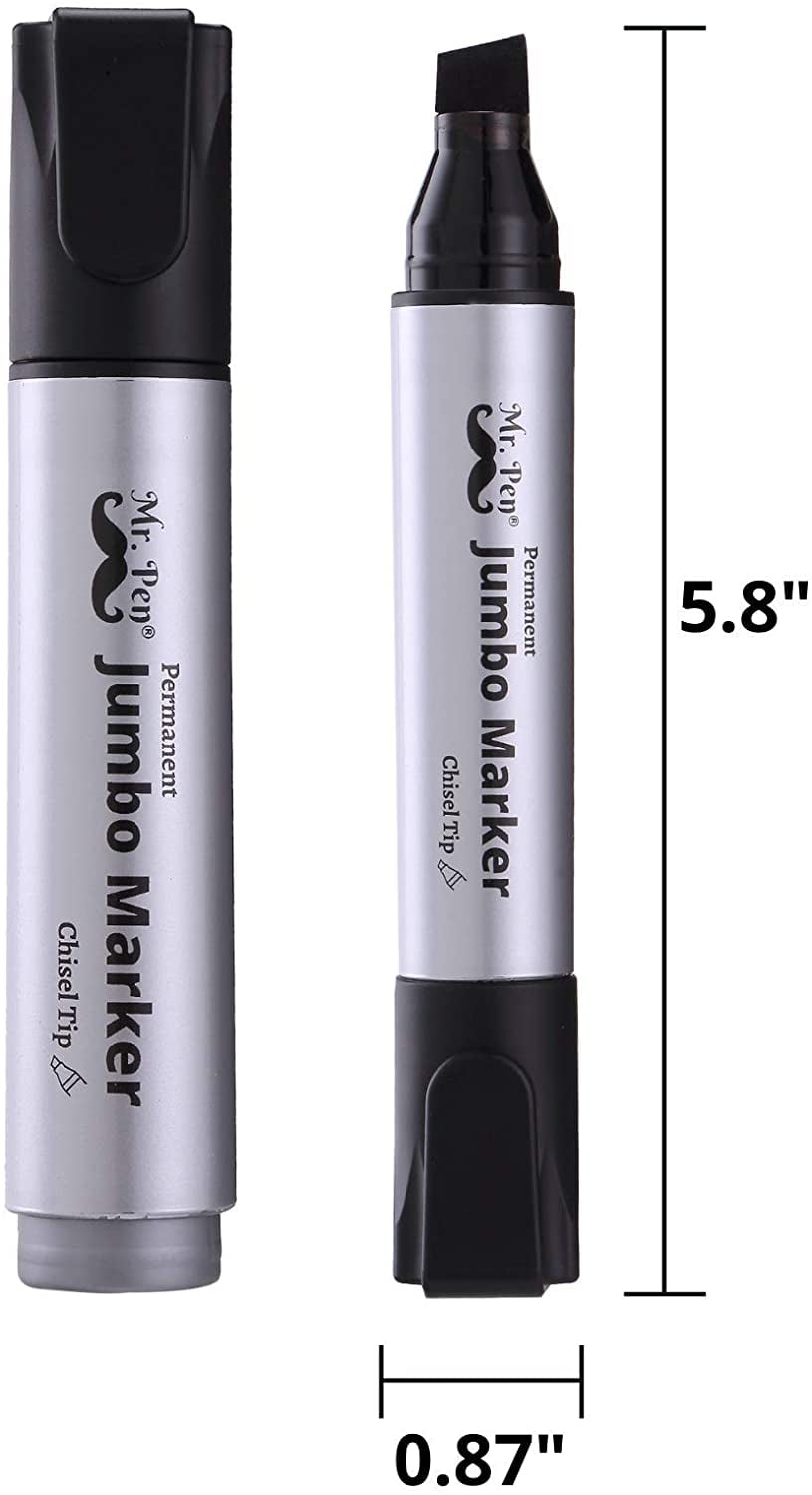 The package includes four jumbo markers with 0.4" chisel tip Great ink supply lasts a long time Mr. Pen fast-drying permanent markers are available in black, green, red and blue Wide point permanent marker makes extra-large lines in one pass Perfect for use on wood, foil, boxes, poster board, concrete, stone, tile, brick, metal, plastics, vinyl, and wax paper