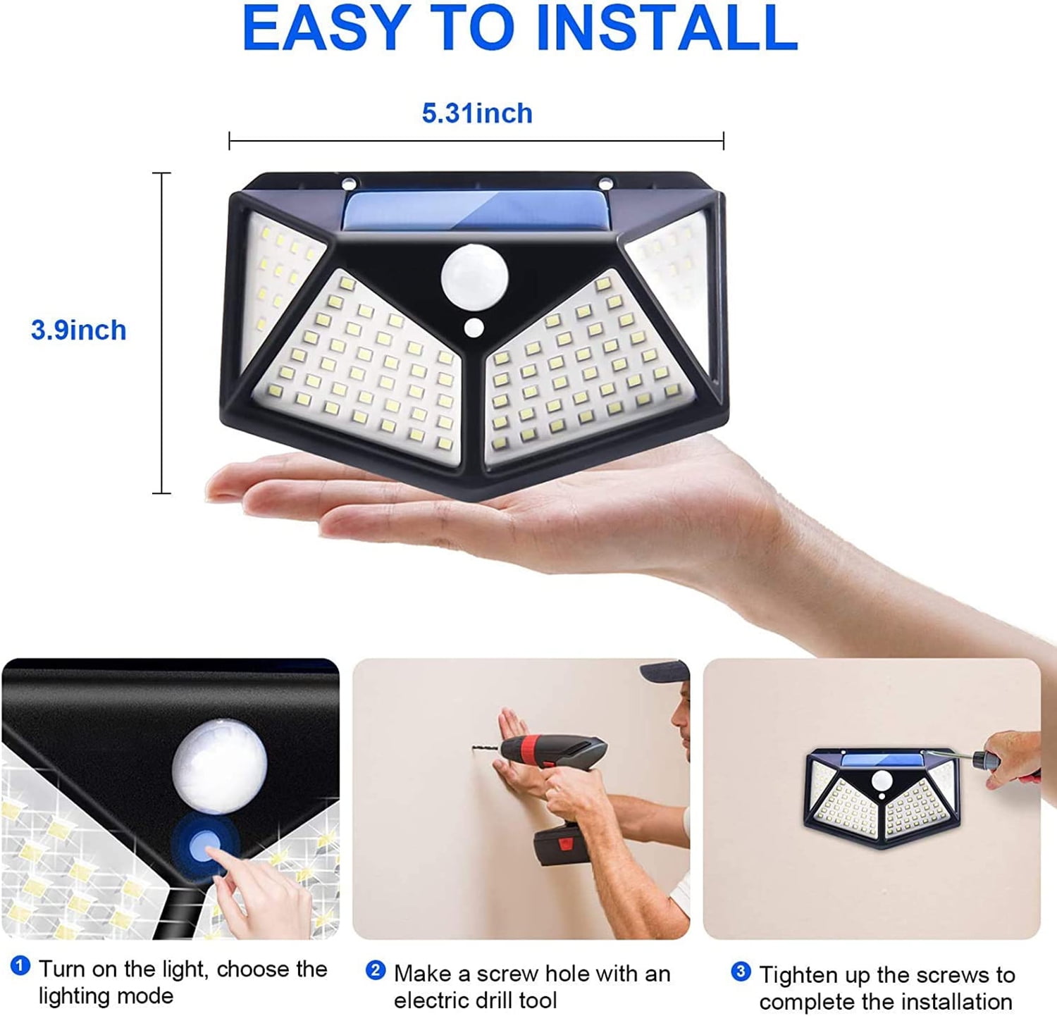 - With 100 LED white lights in 4 sides , increasing both the angle and area of illumination,it can provide way brighter and wider outdoor lighting for places around your house, such as fences, wall, porch, driveway, patio, pathway, stair, garage, attic, front porch, balcony, walkway etc.