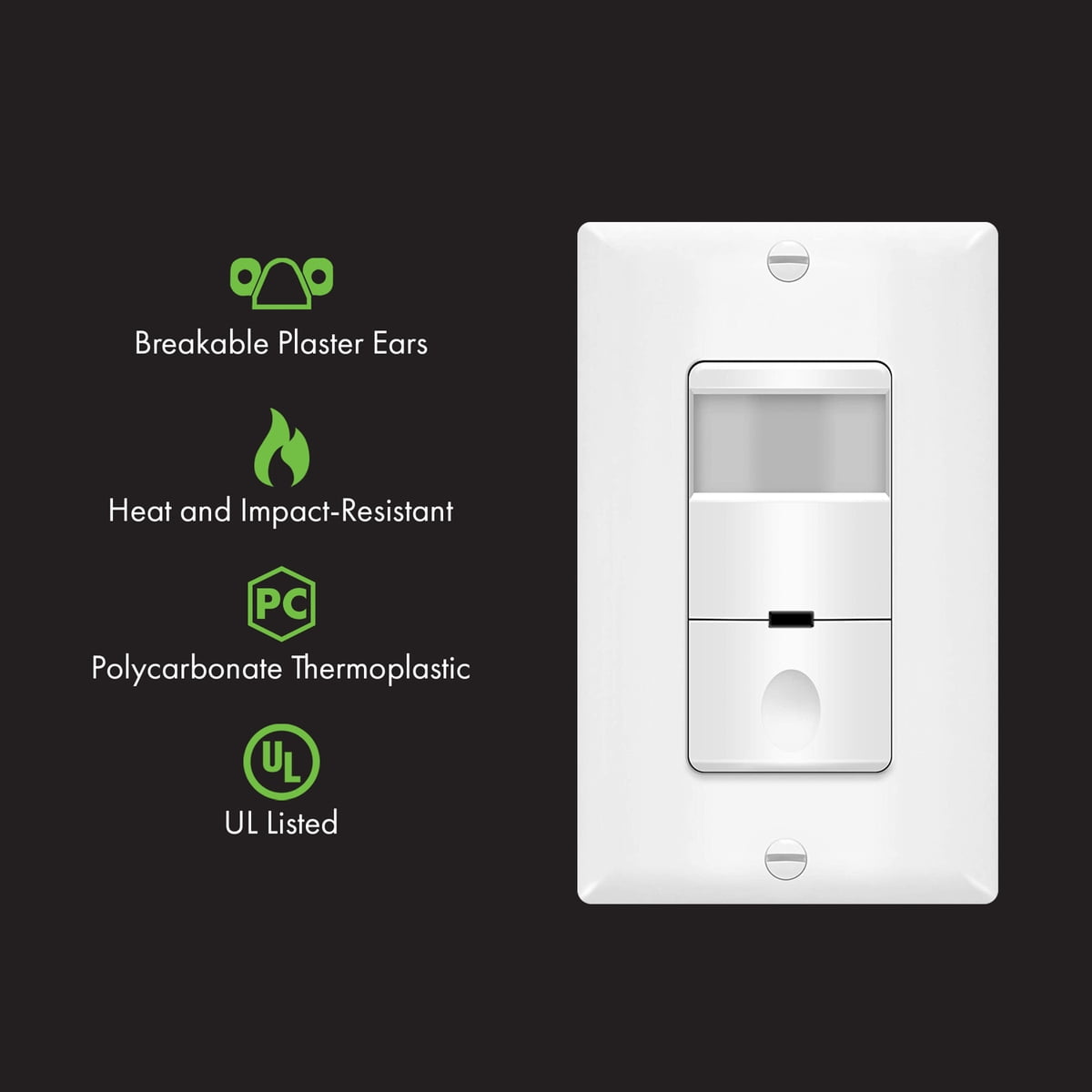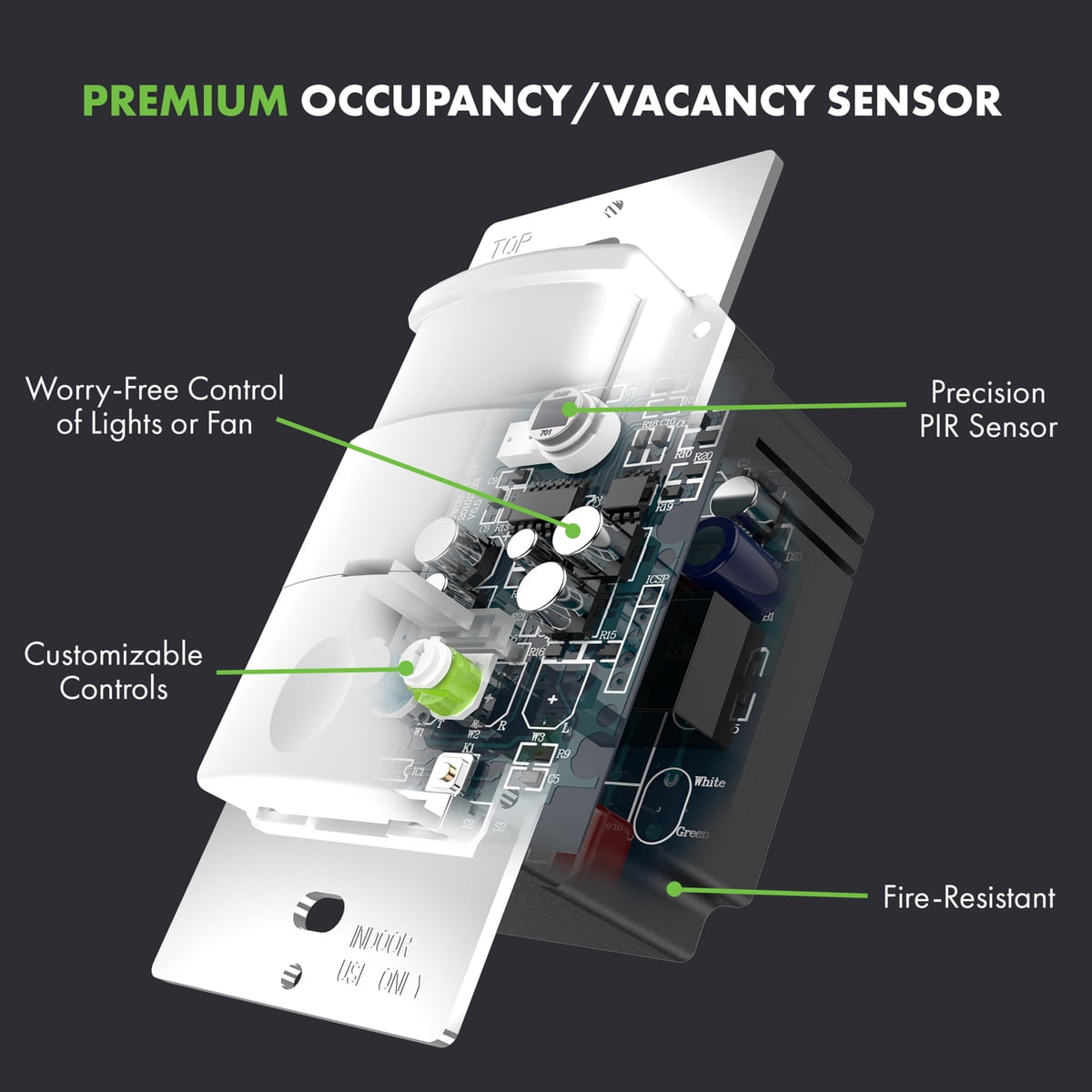 - Sensor wall switch detects motion to automatically turn lights ON and OFF based on the occupancy or vacancy in a room