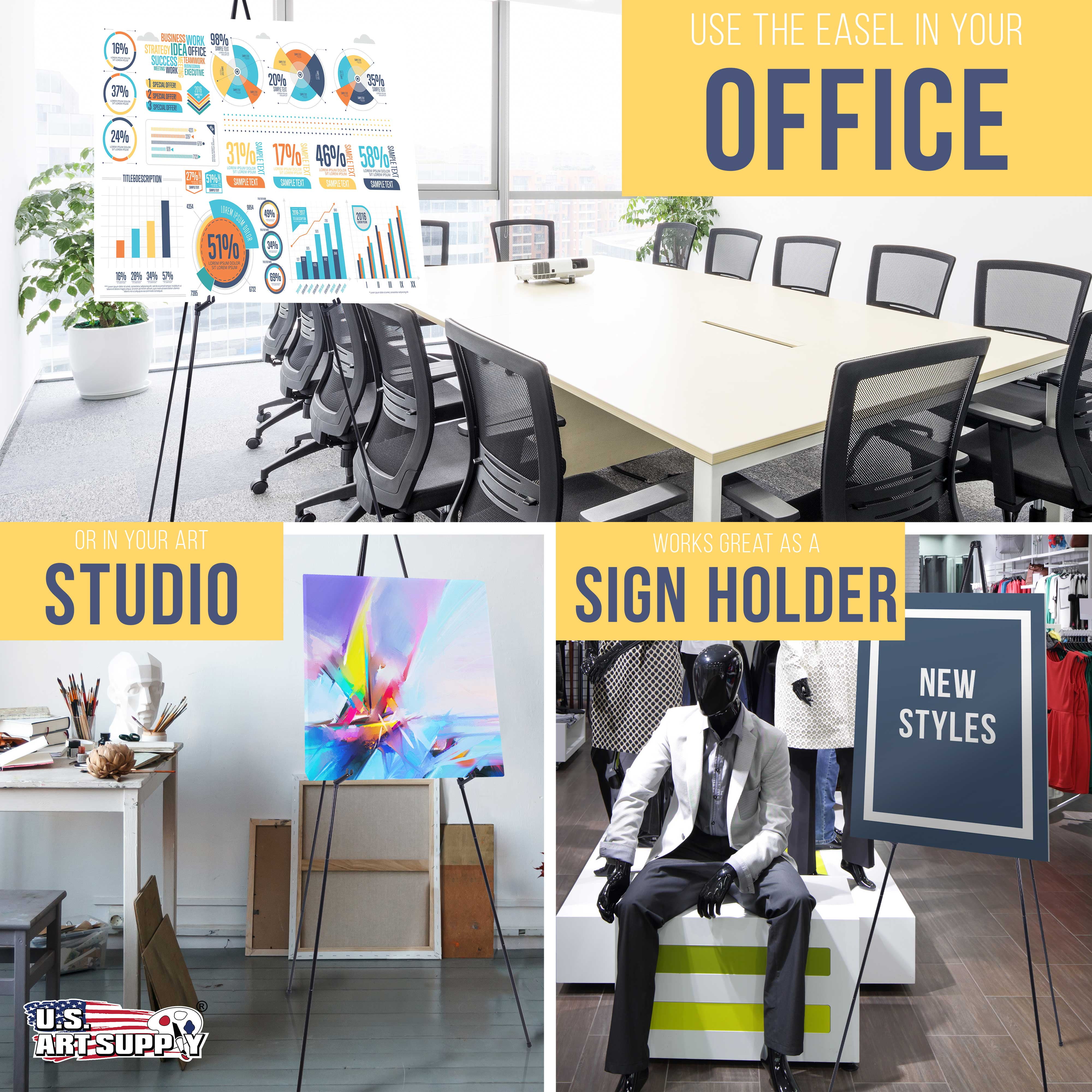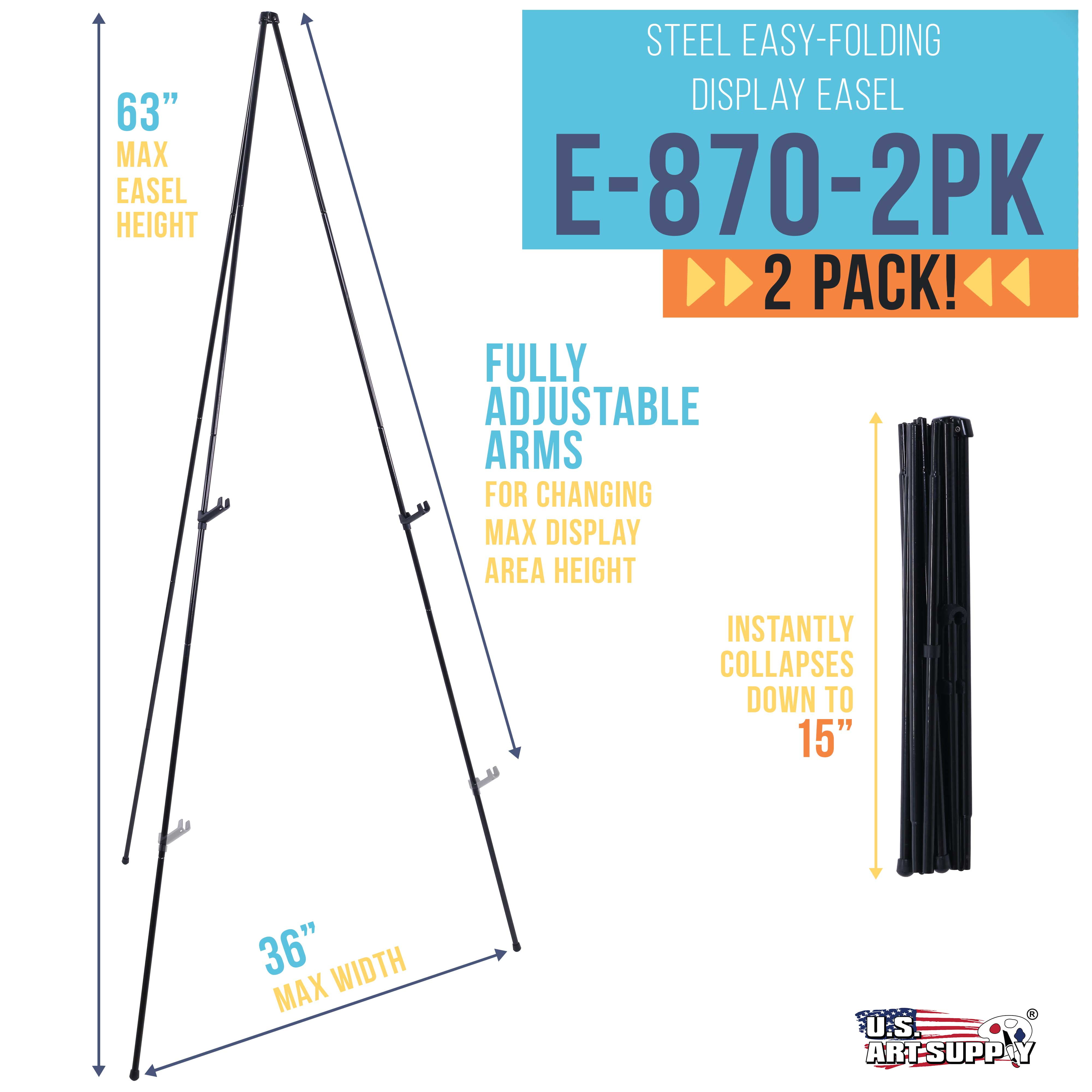 U.S. Art Supply 63" High Steel Easy Folding Display Easel (2 Pack), Instantly Collapses, Adjustable Holders, Portable