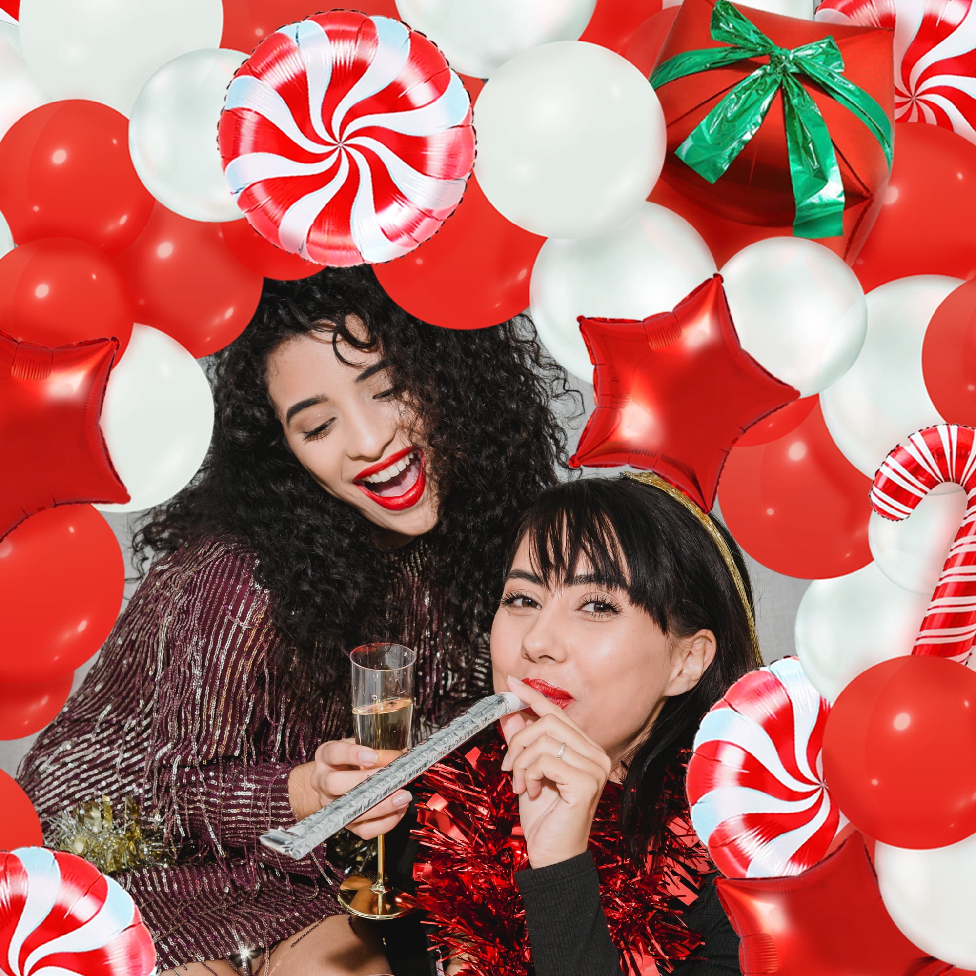 Way to Celebrate! 146PCS Balloon Garland. Each pack contains 30pcs 12inch latex balloons and 90pcs 9inch latex balloons(red and white), 7pcs 18inch candy foil balloon, 7pcs 18inch star foil balloons, 2pcs 16inch candy cane foil balloons, 2pcs 24inch gift box foil balloons, 1pc balloon garland tape 16.4FT, 100pcs sticker dots and straws. This item is suitable for a Variety of Occasions—Christmas-themed balloons are perfect for parties, anniversary parties, children’s parties, company events, barbecues, photoshoots, and any special events to make you an unforgettable party.