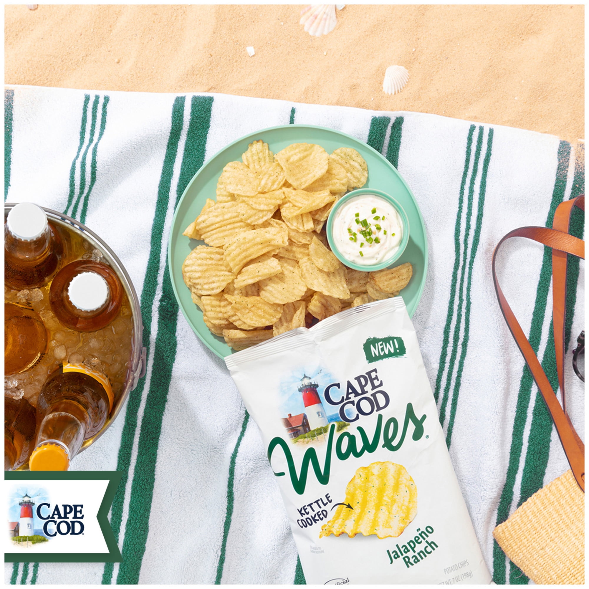 Cape Cod Wavy Cut Jalapeno Ranch Kettle Chips are making waves with these delicious snacks. We start with carefully selected potatoes and slice them thick, in a wavy cut with deep ridges. They’re cooked one, small batch at a time in custom kettles at precisely at the right temperature until they reach a golden-amber hue. Finally, they’re deliciously finished with the pop of Jalapeno and the coolness of creamy ranch. The result is a sturdy ridged chip that is hearty as it is delicious. The unique wave shape of these kettle cooked chips is crafted to hold up to dip. You’ll never leave half of your chip in a bowl again! These chips make a perfect lunchtime side and are delicious right out of the 7-ounce bag, as well as for dipping. Our potato chips are famous for their high quality and remarkable flavor, so be sure to try all the traditional and distinctly unique varieties. Every distinctive chip somehow feels like an invitation to come savor everything that’s special about Cape Cod Kettle Cooked Chips.