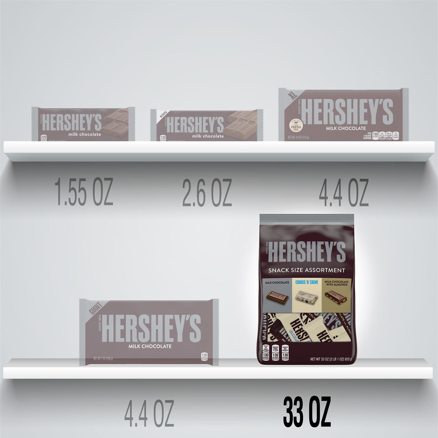 - Contains one (1) 33-ounce bag of assorted snack-size Hershey’s Candy Bars, including Hershey’s Milk Chocolate, Cookies ‘n’ Creme and Milk Chocolate with Almonds