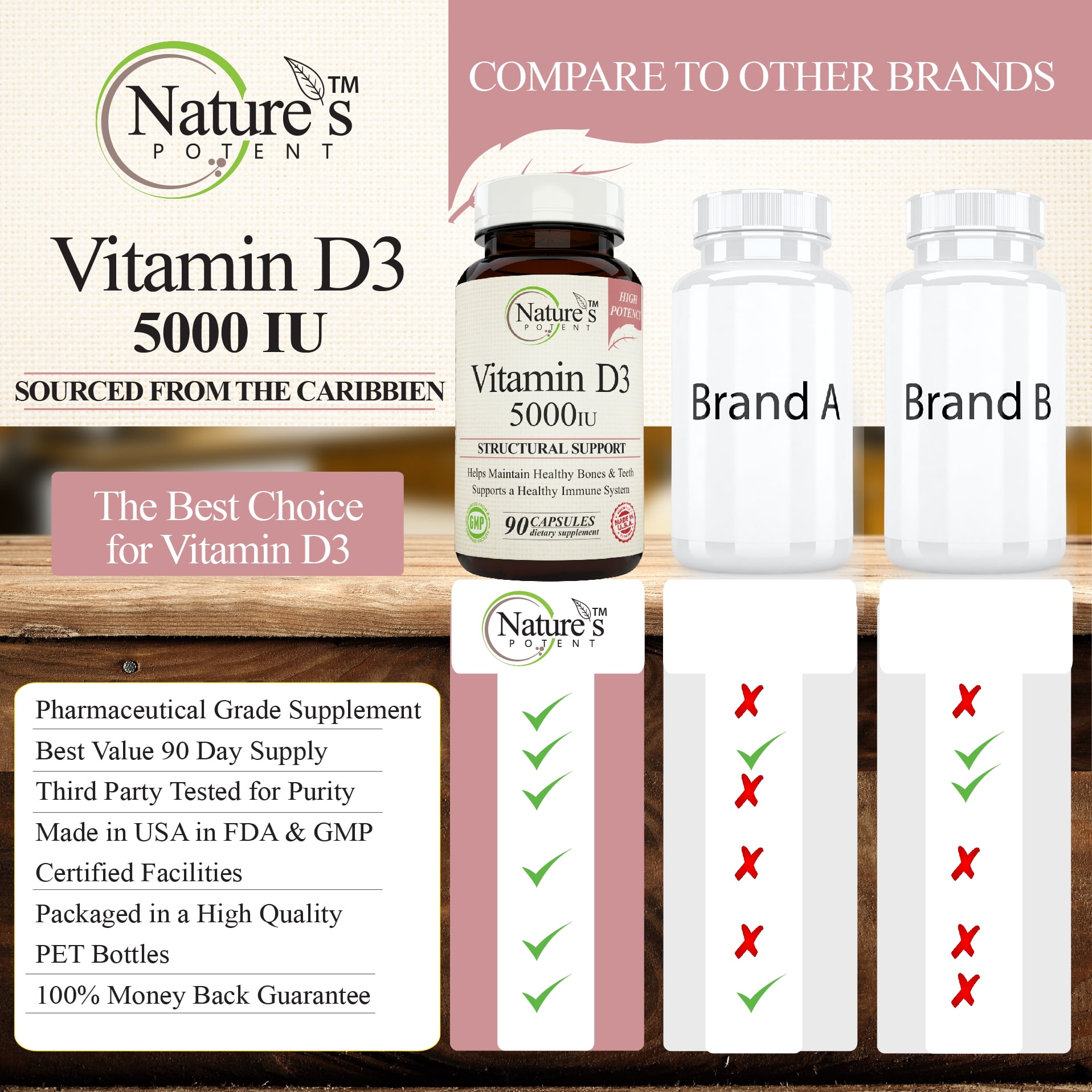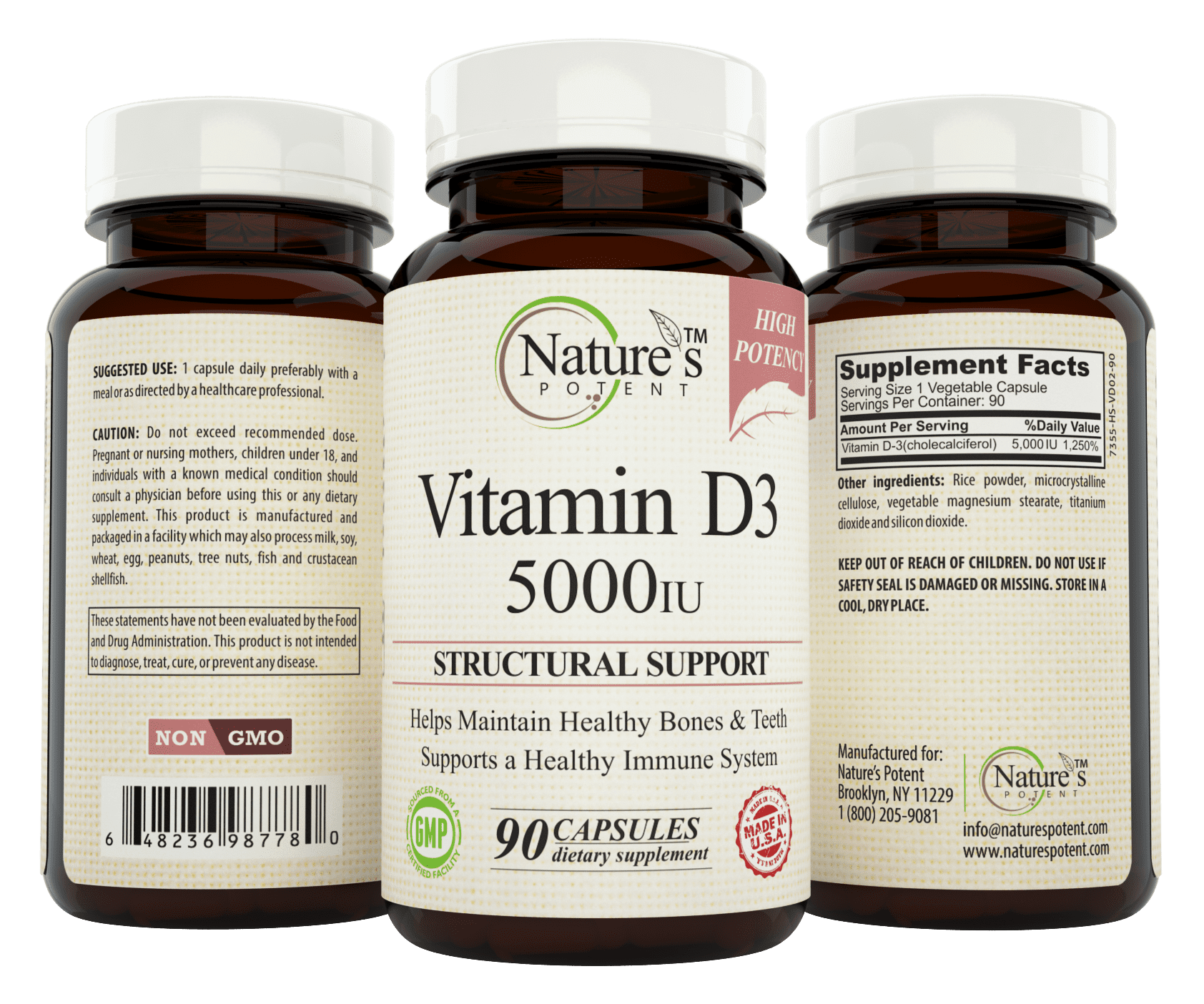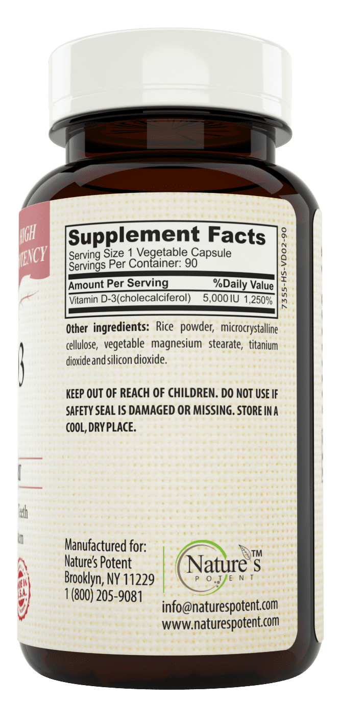 Nature’s Potent Vitamin D3 5000IU is a high potency supplement made in the USA. It doesn’t contain any GMO or dangerous contaminants and meets the highest quality standards for dietary supplements.