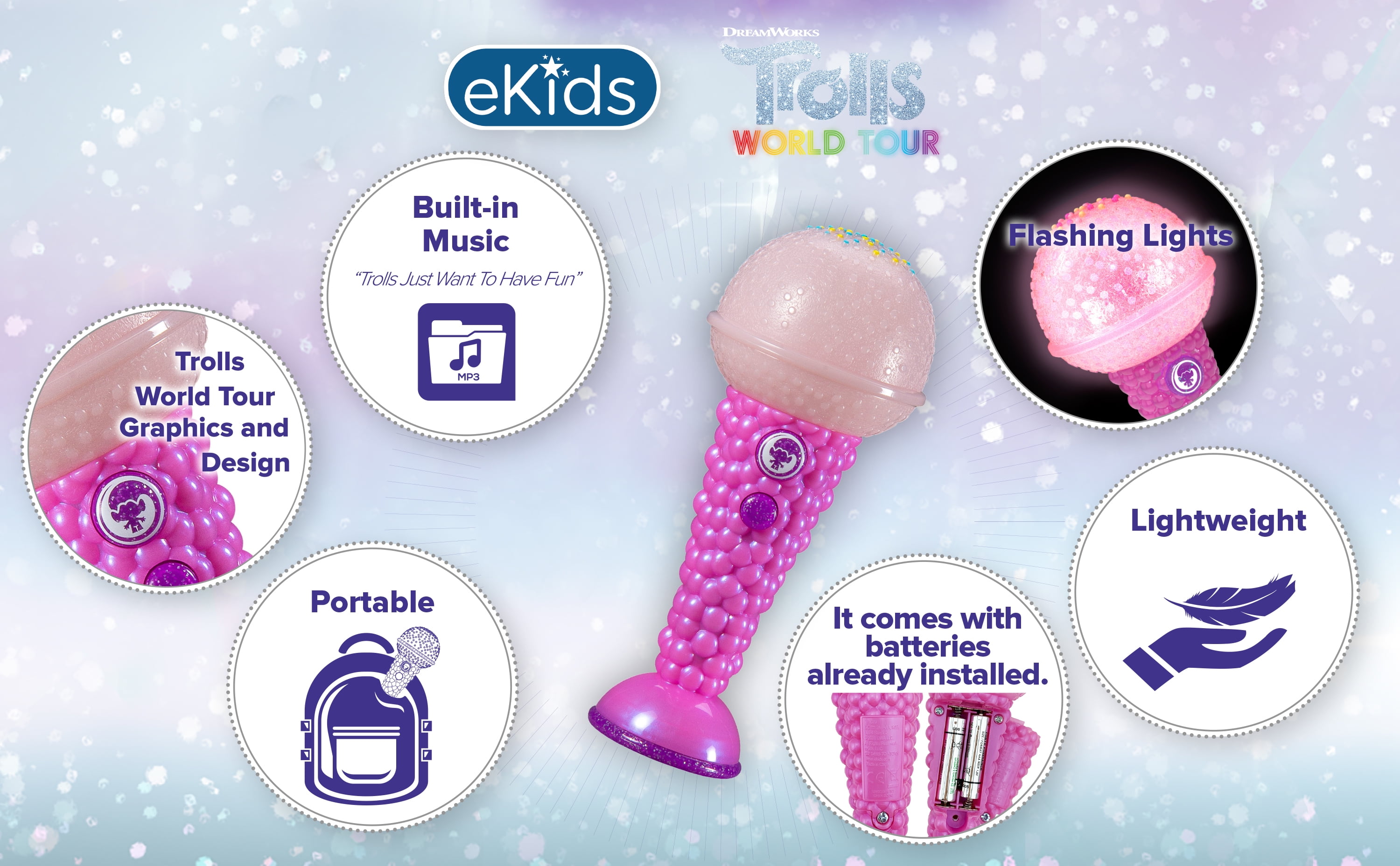 Trolls World Tour Microphone. Trolls Microphone. Trolls Sing Along Microphone. Sing Along to Built-In Music. Lights Flash to Music.Trolls Microphone.