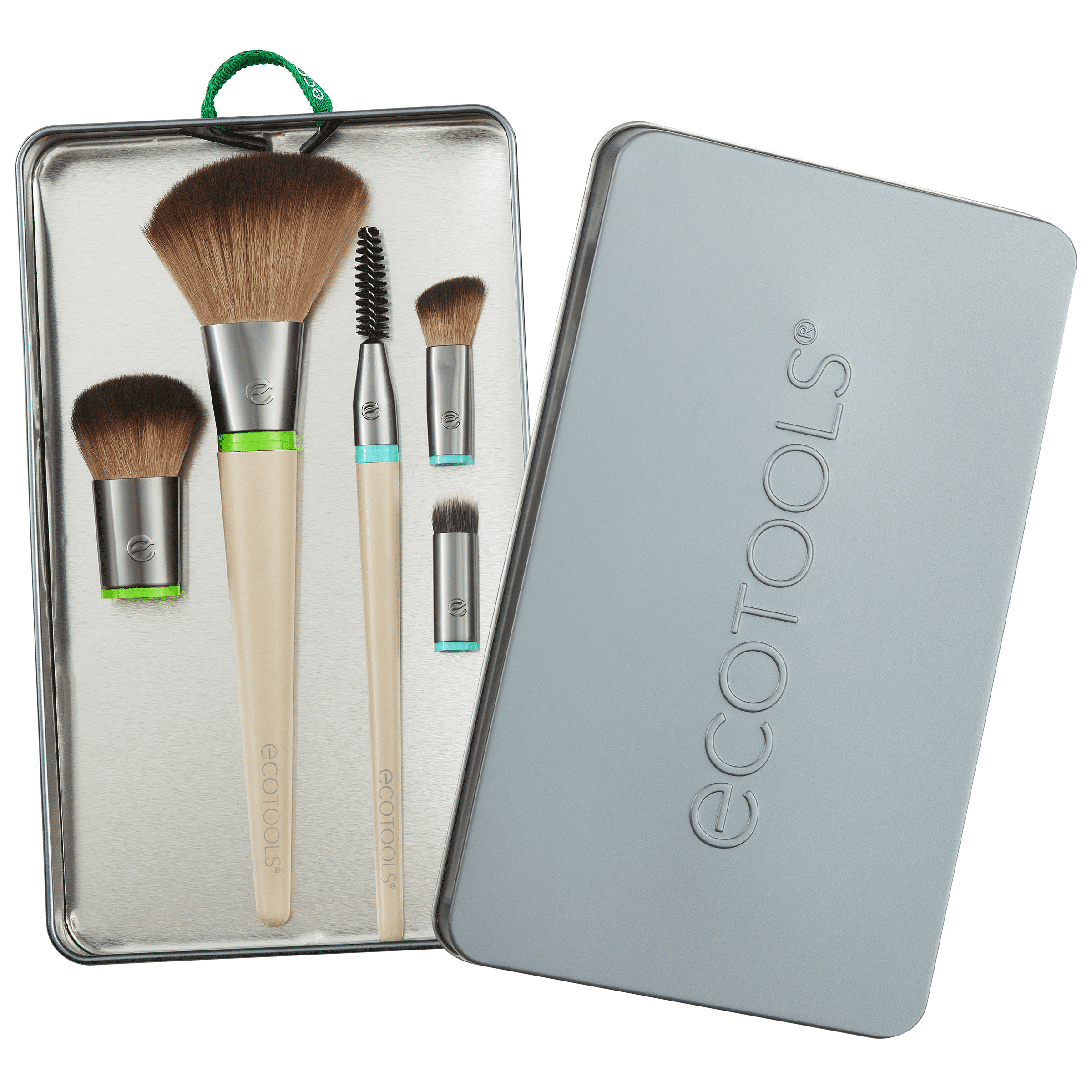 • The EcoTools Daily Essentials Set Includes: (1) large brush handle, (1) small brush handle , (1) Large Angled Blush brush head, (1) Large Base Buffer brush head, (1) Small Spoolie brush head, (1) Small Angled Crease brush head, (1) Small Airbrush Concealer brush head, and (1) Reusable Tin Tray with lid