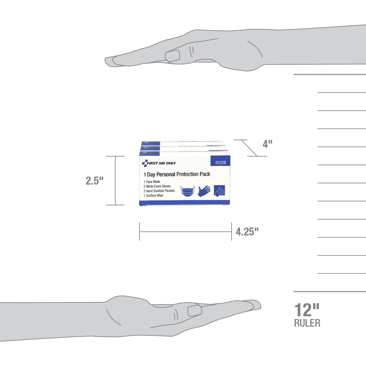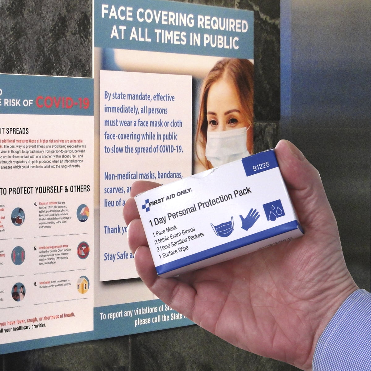 Being prepared, and protected from harmful germs is more important than ever for everyone. The 3 pack of the First Aid Only 1-Day Personal Protection Kit is designed to provide you needed, and in some cases, mandated personal protection like a face mask and gloves, as well as a surface cleaning wipe and hand sanitizer. America is going back to work and school, beginning to travel again for business and pleasure, so be prepared and protected with this grab and go, single use kit. The compact kits are ideal for travel, office, public spaces and recreational activity.