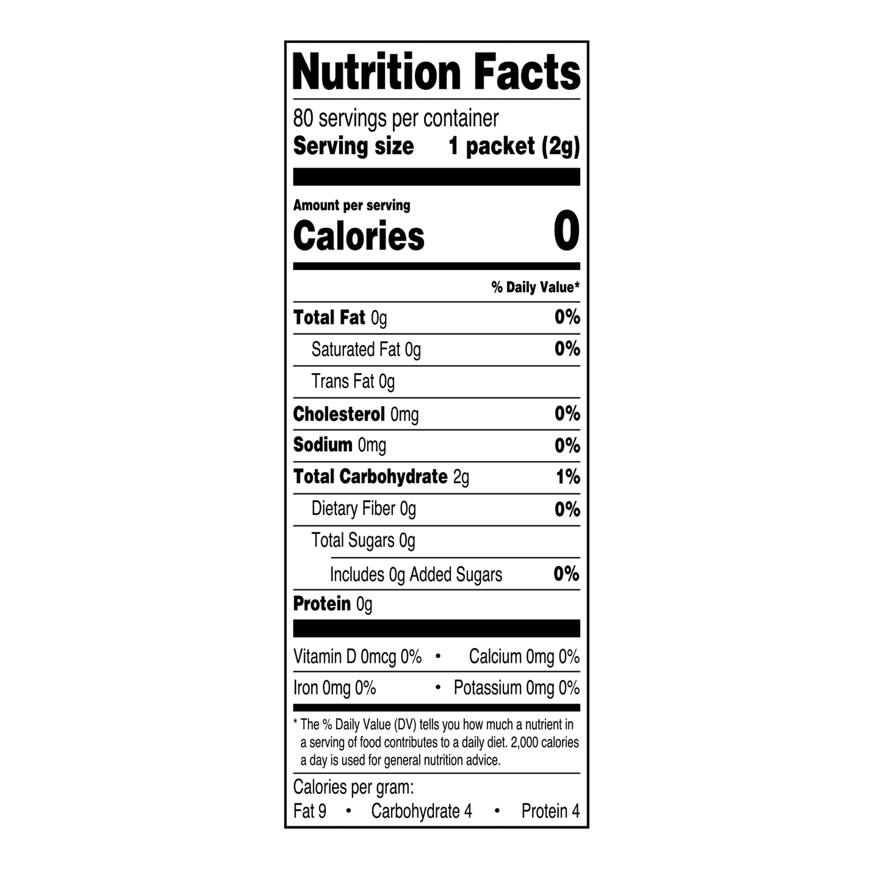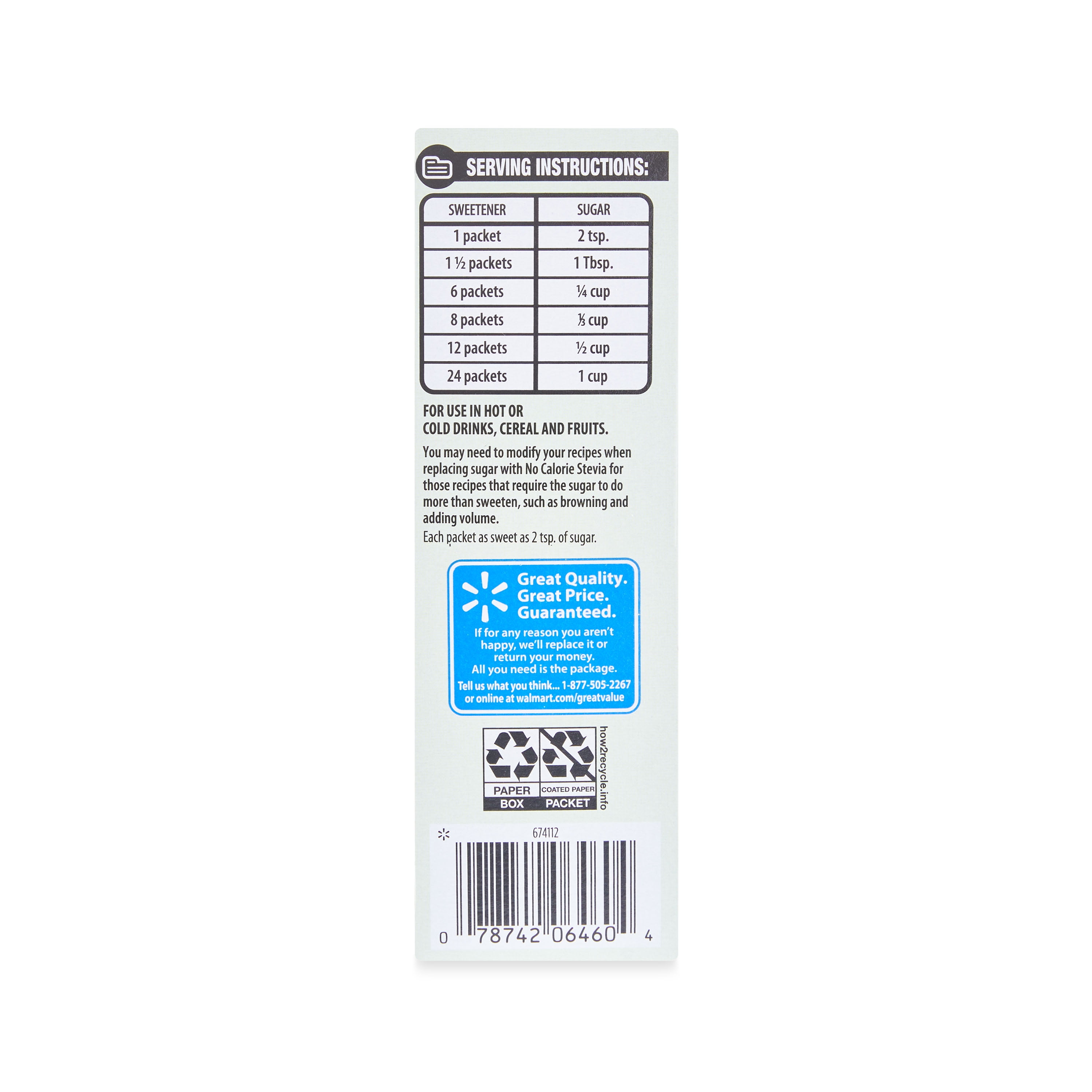 Made naturally from the stevia leaf, Great Value No Calorie Stevia allow you to easily sweeten drinks, cereal, and fruit. Whether you have a family gathering or a sweet tooth craving, thus sweetener gives your food sweetness without the calories. Each packet has the sweetness of 2 teaspoons of sugar, Great Value Granulated No Calorie Stevia is great for baking, using in hot or cold drinks, cereal, and on fruit. Get all the sweetness you want with none of the calories with Great Value Granulated No Calorie Stevia.
