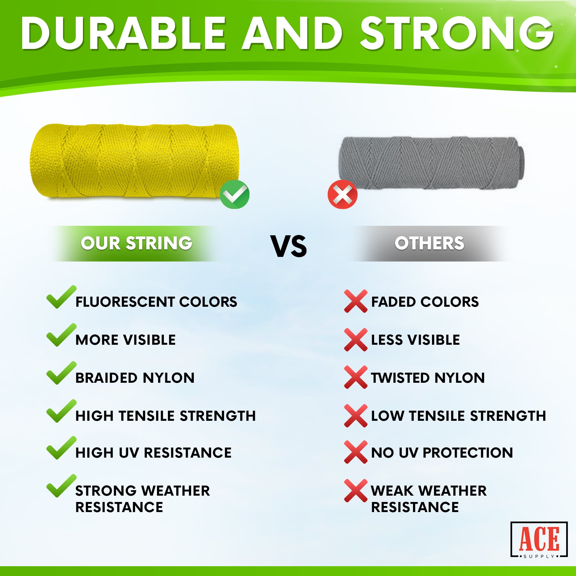- Strong string – This thick string is made of high quality nylon, which is stronger than polypropylene twine. The braided design allows this marking rope to hold up through the harshest conditions!