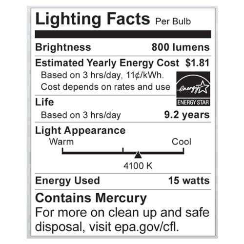 15 watt; A19 Compact Fluorescent; 4100K; 82 CRI; Medium base; 120 volts