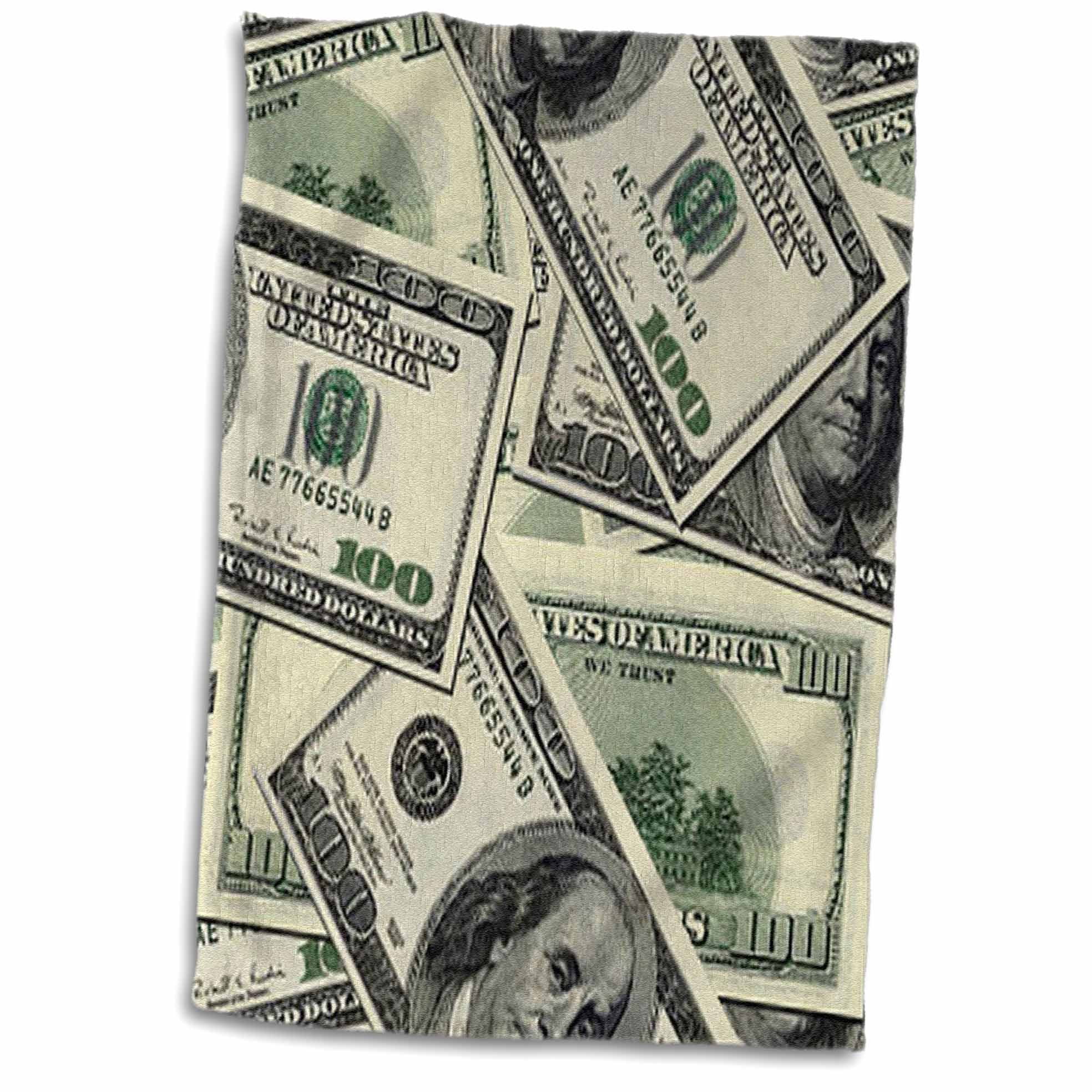 100 Dollar Bill Pattern Towel is great to use in the kitchen, bathroom or gym. This 15 by 22 inch, hand/sports towel allows you to customize your room with a special design or color. Great for drying dishes, hands and faces. Suitable to put in any sports bag. Image will not fade after washing. Machine wash, tumble dry low, do not bleach. Towel will regain its fullness after the first washing. Made of 63% polyester (microfiber) /37% cotton (velour terry cloth). Image printed on microfiber side/ terry cloth side blank.