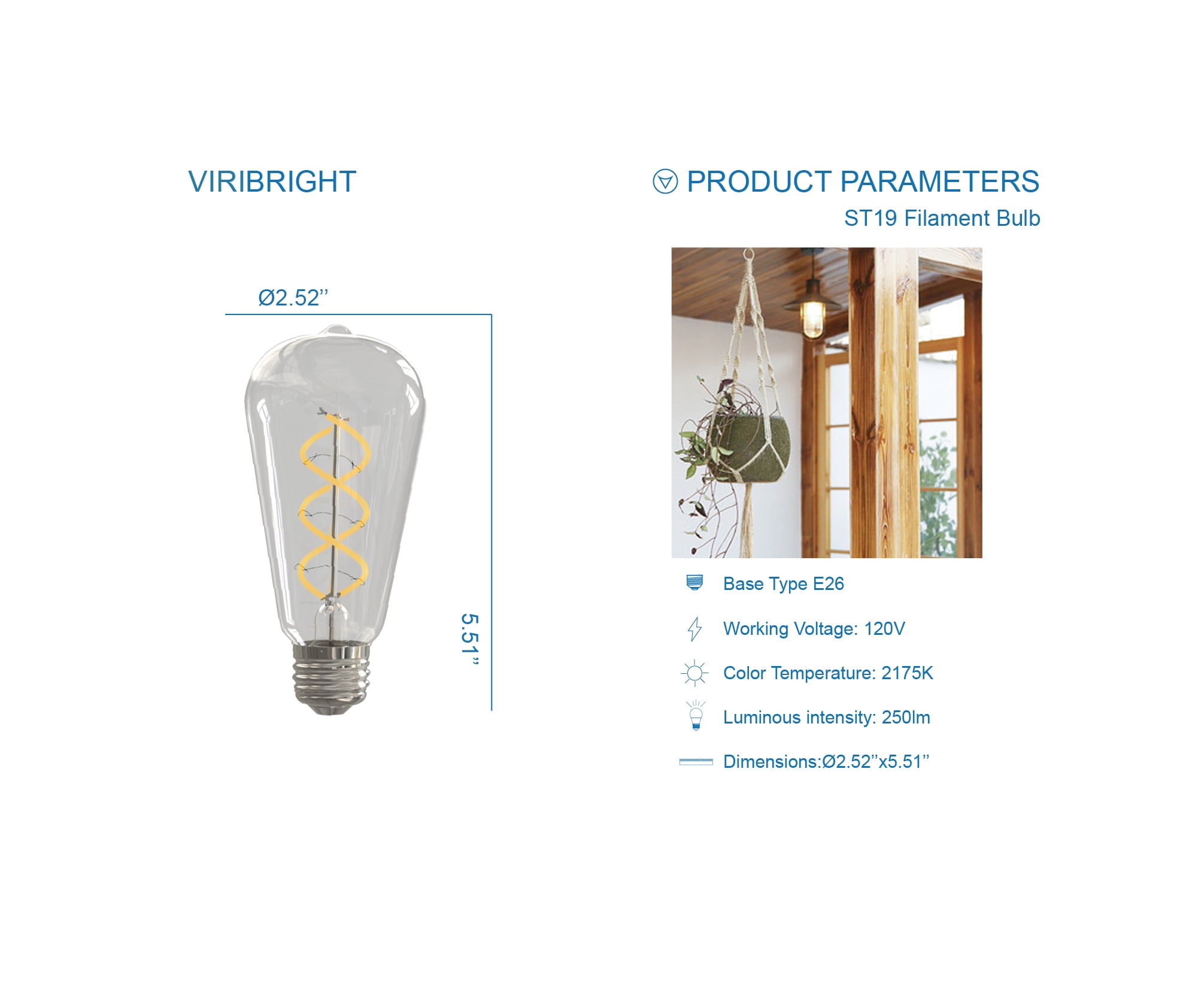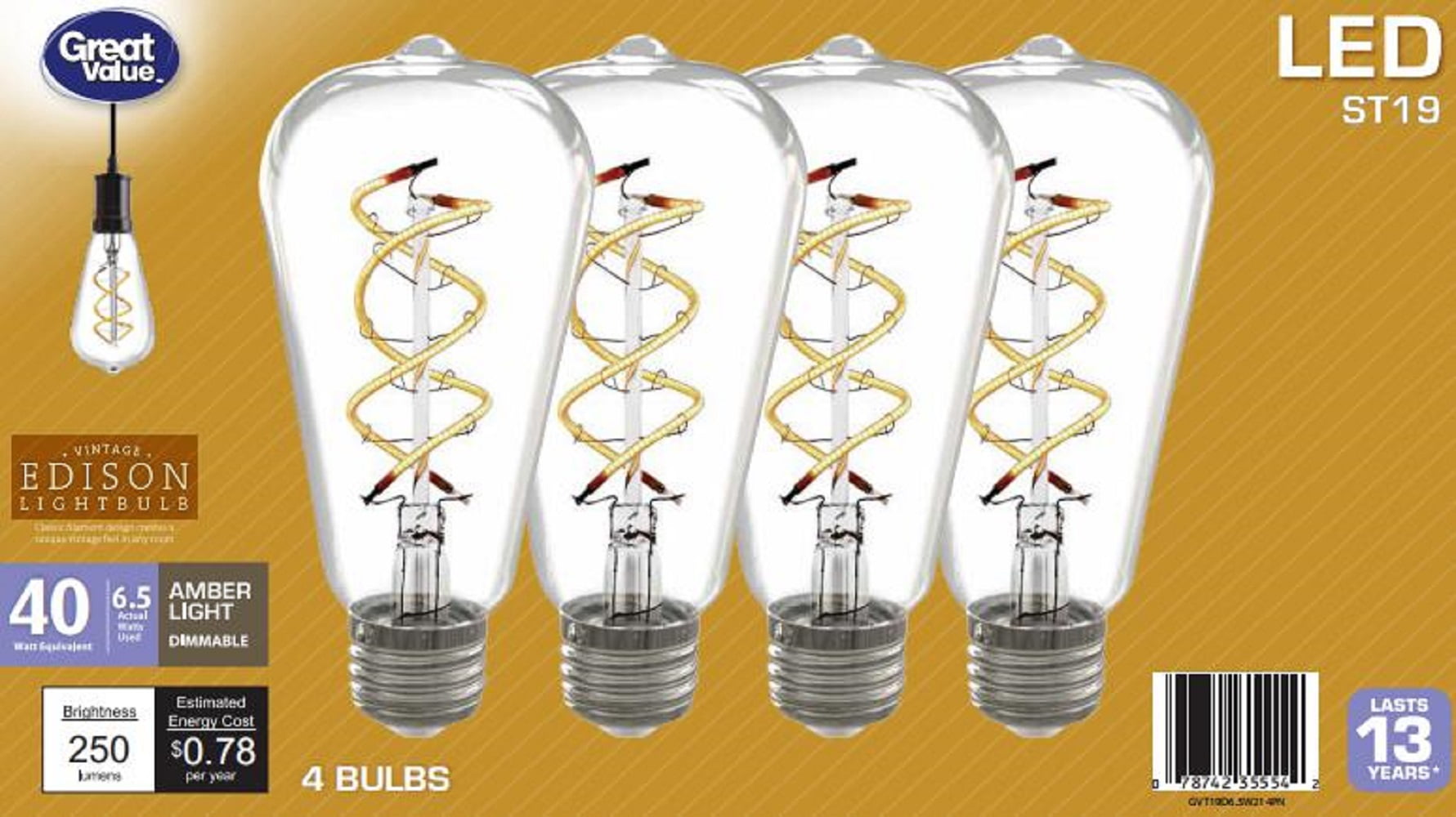 Great Value Spiral Filament LED light bulb Vintage 40-Watt Replacement Amber light ST19 LED light bulb creates a dramatic focal point in any room.The sizeable glass globe and delicate spiral filament beautifully accent traditional or modern fixtures. A warm amber light glow that recreates the feel of Edison-style incandescent bulbs. These LED light bulbs are dimmablehave a clear all-glass exteriorand provides an omni-directional (360°) distribution of light.This decorative bulb is rated to last 13 years based on 3 hours per day use. This light bulb uses only 6.5-Watt of energy – that is a 93% savings over traditional lighting – and that means savings on your energy bill every month.It features instant full brightness and is free of Mercury for easy disposal. Use this Vintage Style ST19 pear-Shaped bulb with a medium base in dimmable pendant lightstable lamps and floor lamps. Remove the lamp shade and highlight the refined style of GV Vintage Style LED bulbs. Bulbs can not perform properly with incompatible dimmers. Dimming compatibility list as attached photo. NOTE: This equipment has been tested and found to comply with the limits for a Class B digital devicepursuant to part 15 of the FCC Rules. These limits are designed to provide reasonable protection against harmful interference in a residential installation. This equipment generatesuses and can radiate radio frequency energy andif not installed and used in accordance with the instructionsmay cause harmful interference to radio communications. Howeverthere is no guarantee that interference will not occur in a particular installation. If this equipment does cause harmful interference to radio or television receptionwhich can be determined by turning the equipment off and onthe user is encouraged to try to correct the interference by one or more of the following measures: 1.Reorient or relocate the receiving antenna. 2.Increase the separation between the equipment and receiver. 3.Connect the equipment into an outlet on a circuit different from that to which the receiver is connected. 4.Consult the dealer or an experienced radio/TV technician for help.