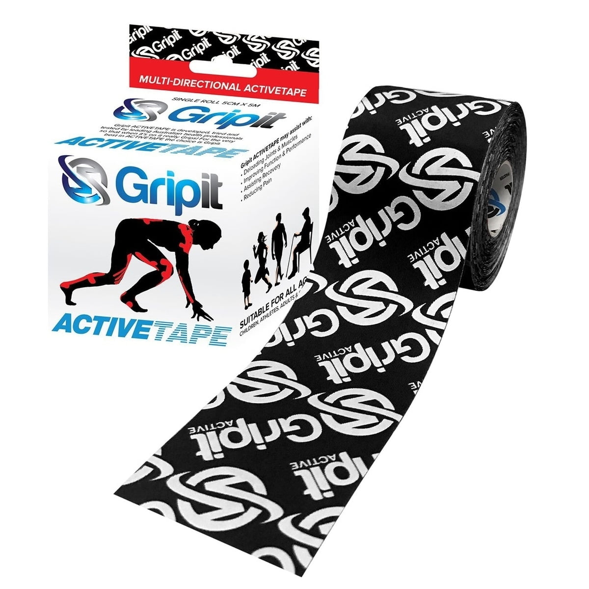 Gripit ACTIVETAPE assists in unloading muscles and joints, reducing pain and enhancing performance and recovery. It is smooth and comfortable to wear and does not contain latex or zinc oxide. Gripit Active is unique in that it is multi-directional and a 260% stretch which means it is highly elastic and stretches in both directions. By being able to stretch in both directions, it can adhere closely around joints and body parts for maximum full dynamic support and unloading. It features a blend of nylon and cotton cloth giving it a light and athletic feel, which is durable and contours well to all body shapes and sizes. The breathable fabric dries quickly, so that it is perfect for showering, swimming, water sports and frail sensitive skin. Its advanced Japanese adhesive technology provides maximum stick and ensures you can have confidence in it sticking through any high-level sport, recreational activities or working conditions. It is best applied on the body at a stretched and shortened position. When taped appropriately, the Gripit Active can provide mechanical assistance to a joint or muscle allowing for full movement as it stretches. It can also absorb force (load) and slow down movement (reduced eccentric contraction workload). Using the elastic recoil stretch properties, it can therefore be used to transfer the absorbed energy into assisting movement. It adheres well to both skin as well as itself, meaning you can apply multiple layers of tape to enhance the unloading muscle effect while still not restricting movement and is safe to use on all ages from children through to adults as well as during pregnancy. It measures 2 inches x 5.5 yards and comes in a red color.Gripit ACTIVETAPE, 2" x 5.5 yds, Red with logo