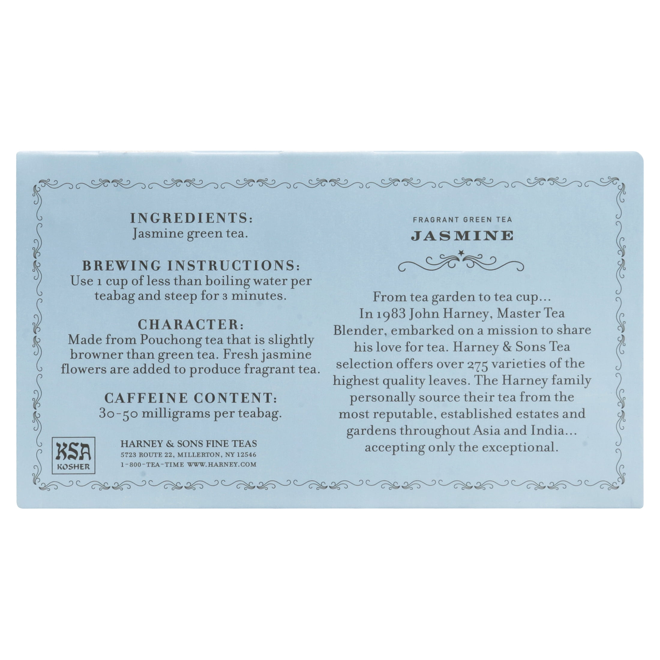 Made from Pouchong tea that is slightly browner than green tea, we add fresh jasmine flowers to produce a delicate and fragrant brew. Try our convenient box of 50 tea bags. Each tea bag brews a 6 to 8 oz cup of tea.