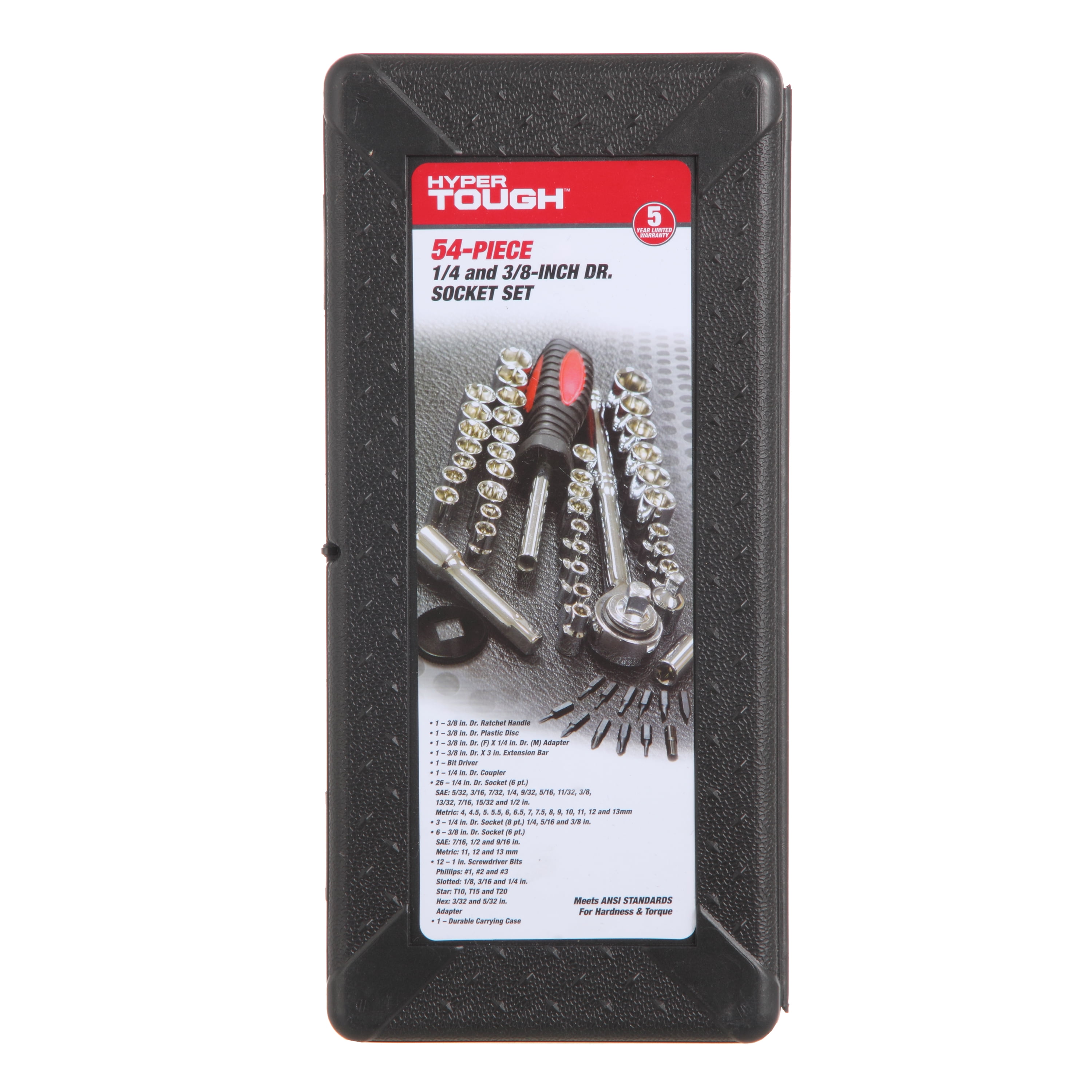 Ideal for auto mechanics or everyday car or home repairs. To throw in your car for emergencies or whatever job you need a quick set for. Hyper Tough 54-piece socket set is great for you at home and small mechanics jobs. This set provides a wide array of commonly used sockets 1/4" and 3/8" inch sockets, displays the sizes in both Metric and SAE (inches), making it easy to quickly find what you need. Also this set includes a 3/8-inch drive handle, a 1/4-inch bit adapter, a 3/8-inch extension bar and specialty bits that makes it easy to reach into a narrow or deep spaces. This Hyper Tough 54-piece socket set housed in a handy blow-molded case for easy tool storage and carry. Each powerful tool features a forged & heat-treated steel body for reliable torque and strength, plus a full polished-chrome finish to ensure corrosion-resistant performance. Reversible mechanism for easy operation. This Hyper Tough 54-piece socket set meets ANSI standards for hardness and torque.