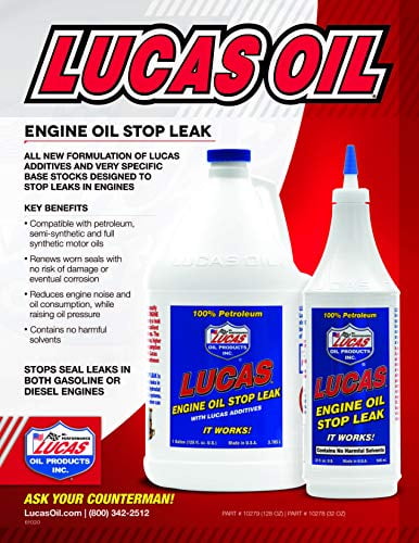 Lucas Engine Oil Stop Leak is an all new formulation of Lucas additives and very specific base stocks designed to stop seal leaks in engines.