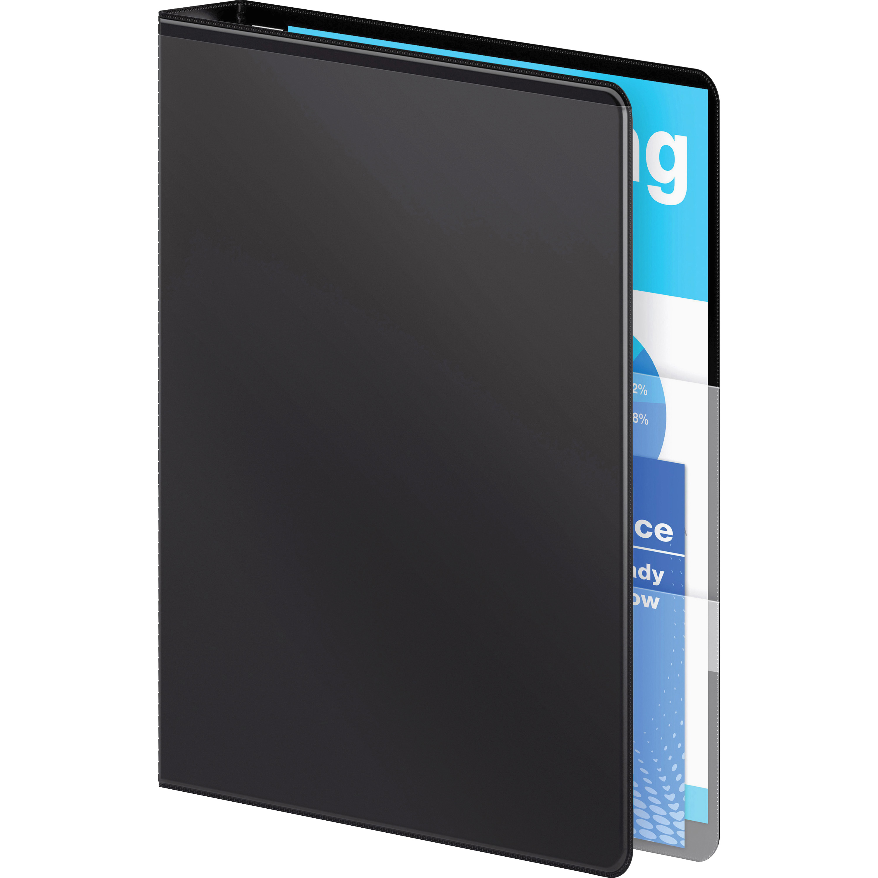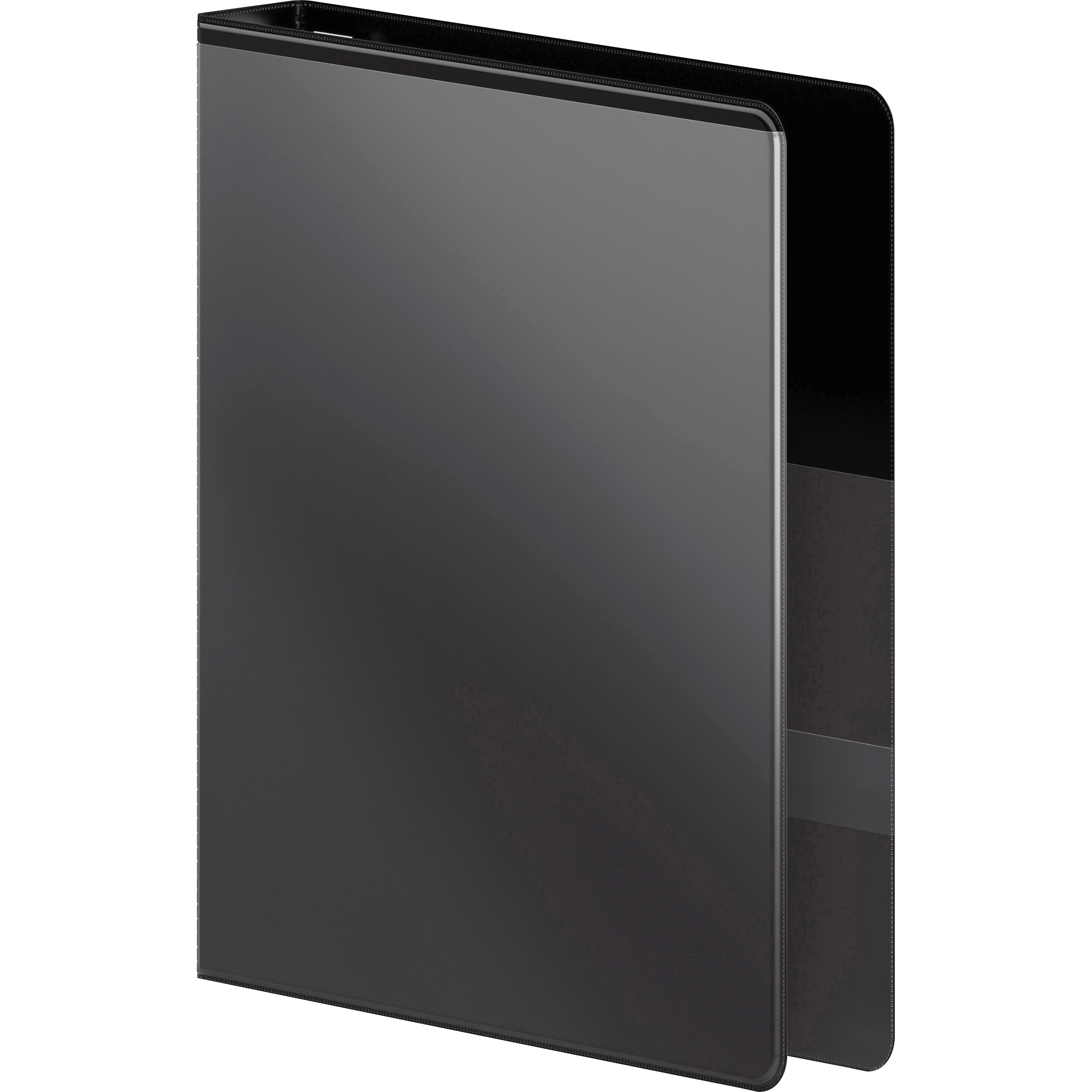 Heavy-duty binder features a locking mechanism that lets you open and close the metal round rings with a single touch, making it easy to add or change contents. Clear, nonglare, one-piece overlay on front, spine and back allows easy transformation into a custom binder, perfect for presenting your work. The CleanView polypropylene material resists ink and toner transfer so printed papers won’t stick or mark binders. Four stacked opaque pockets provide maximum storage. Binder also features a sturdy chipboard core.