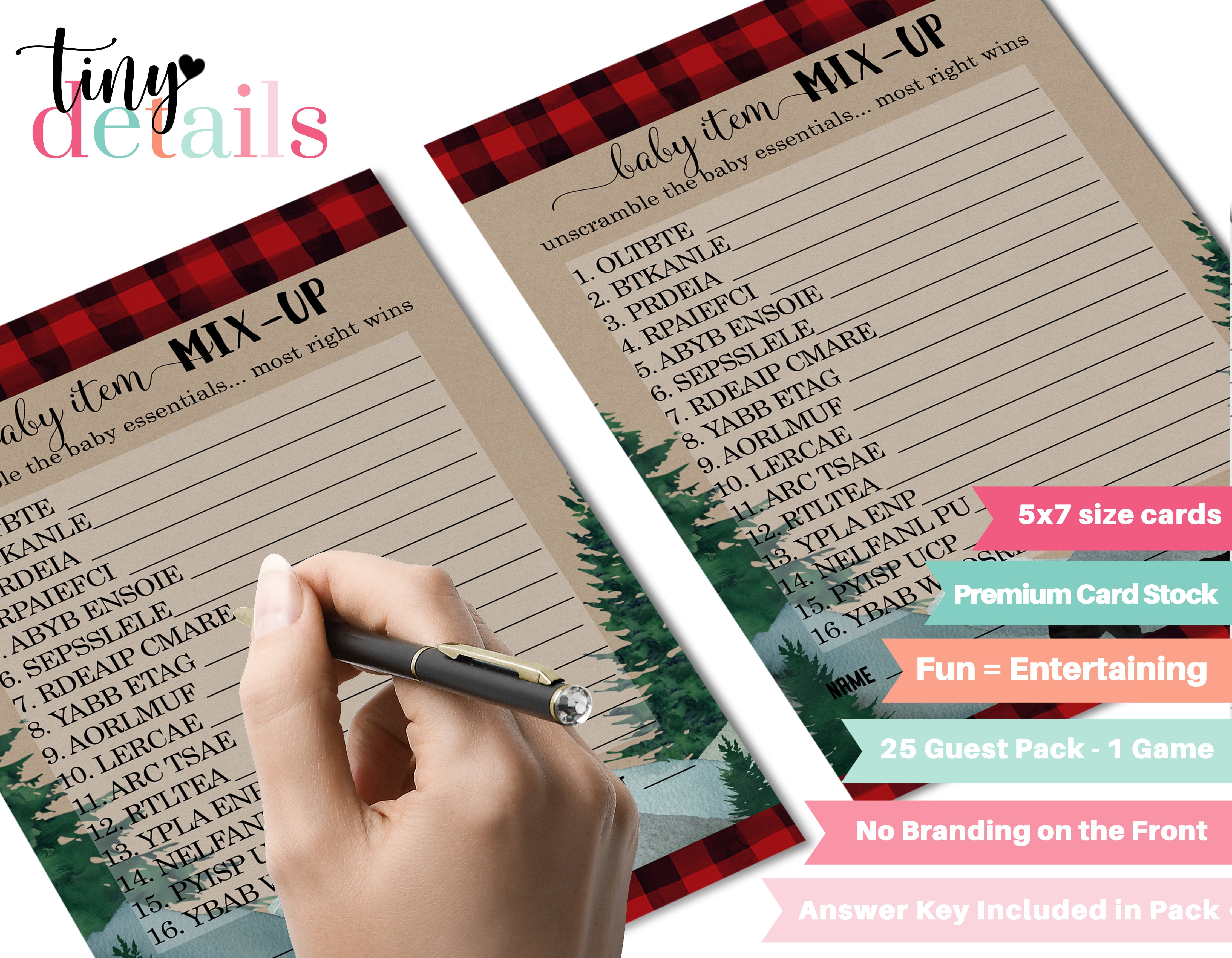 Lumberjack Baby Shower Game Word Scramble 25 Pack Unscramble Activity Cards Rustic Little Bear Design Red and Black Theme – Printed 5 x 7 Size Set – Paper Clever Party
