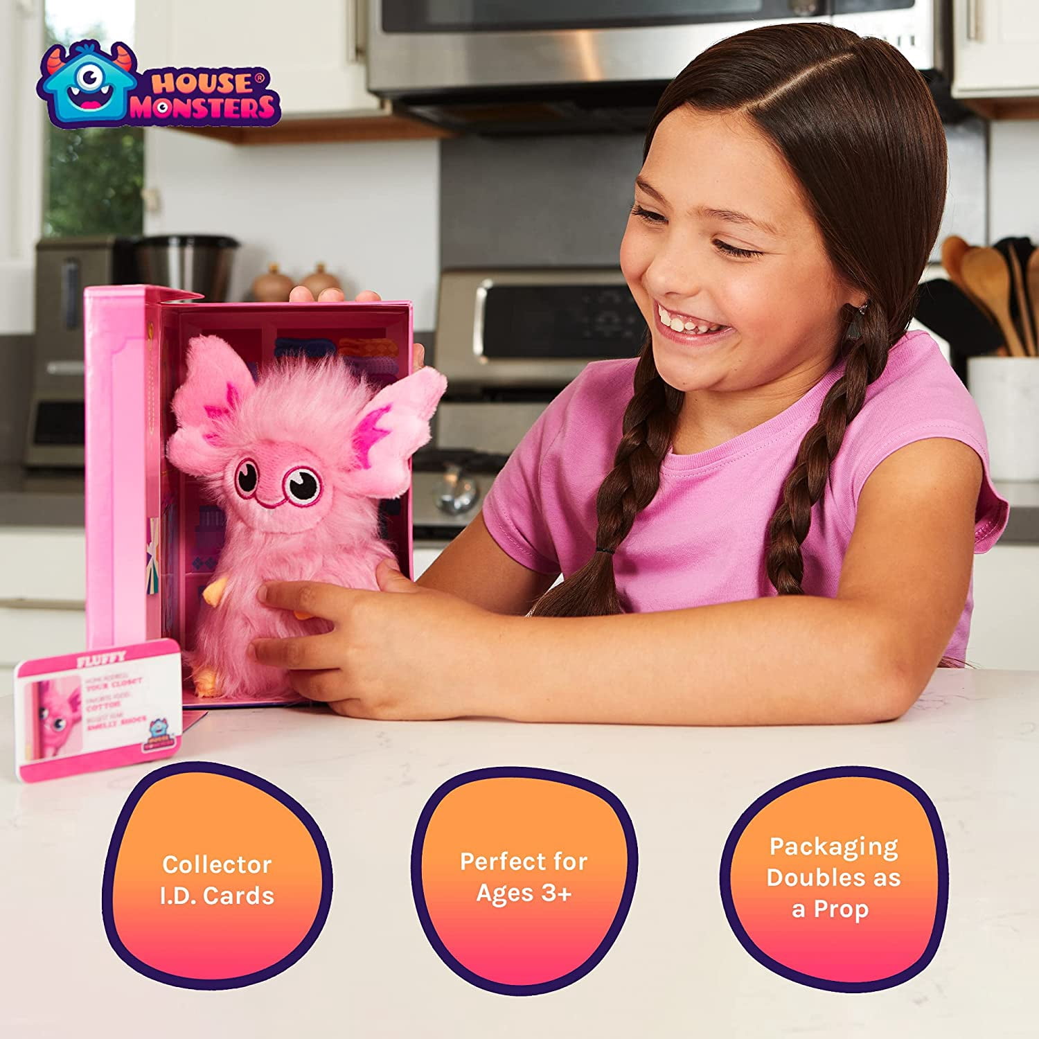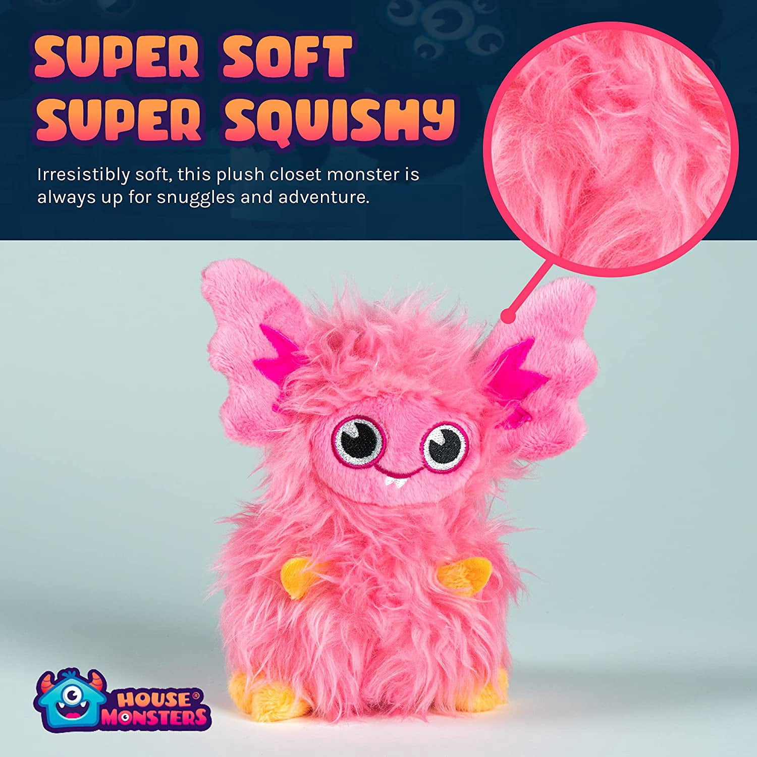You can have fun with Fluffy, hiding her in her closet box or anywhere in the house. Or – toss her in your backpack for on-the-go play. Fluffy the House Monster is perfect for playtime and cuddling up with at night.