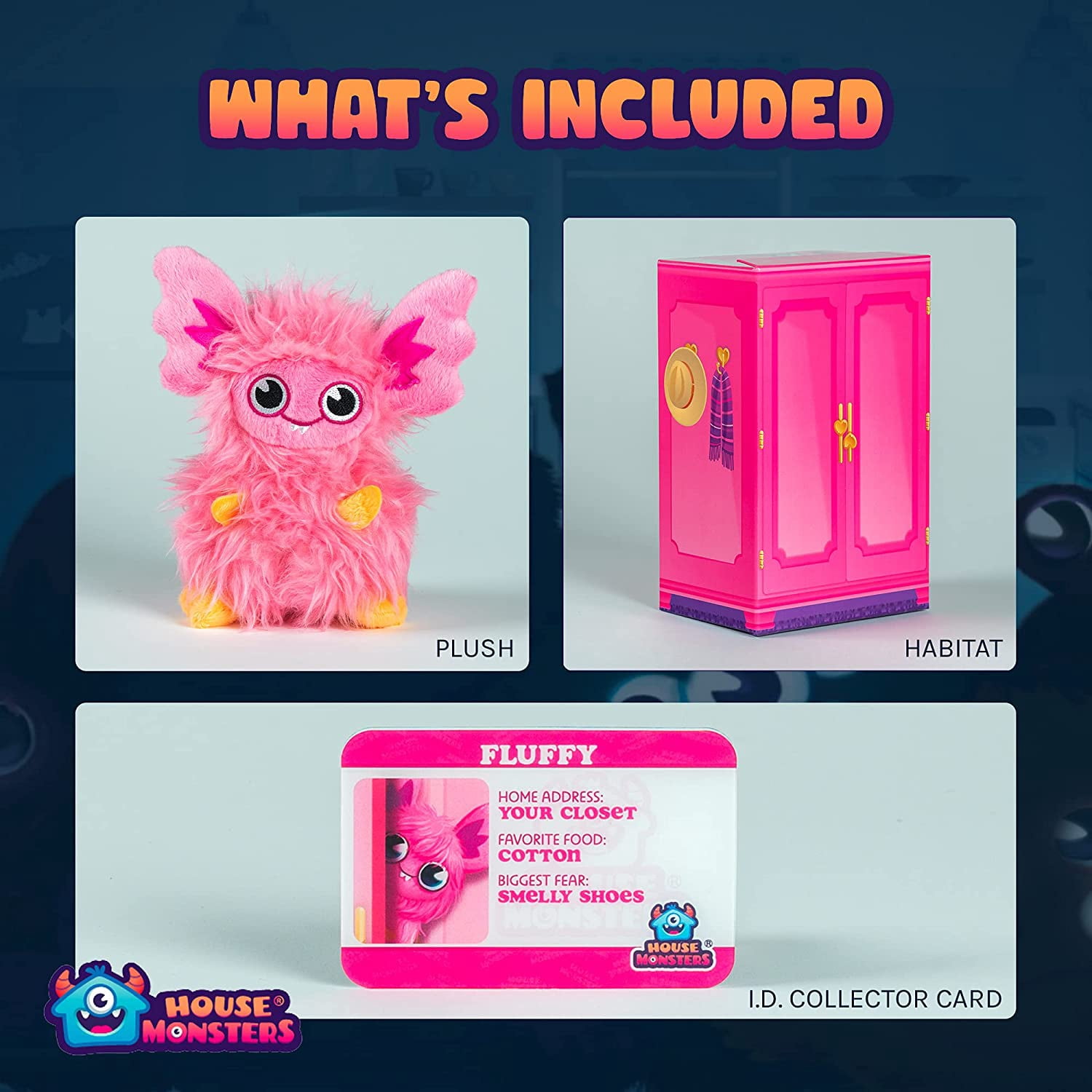 - COLLECTOR I.D. CARDS: House Monsters come with a sturdy, wallet-sized collector I.D. card. The front displays the character’s picture and shows the monster’s home address (hiding place), favorite food, and biggest fear, with a group shot on the back.