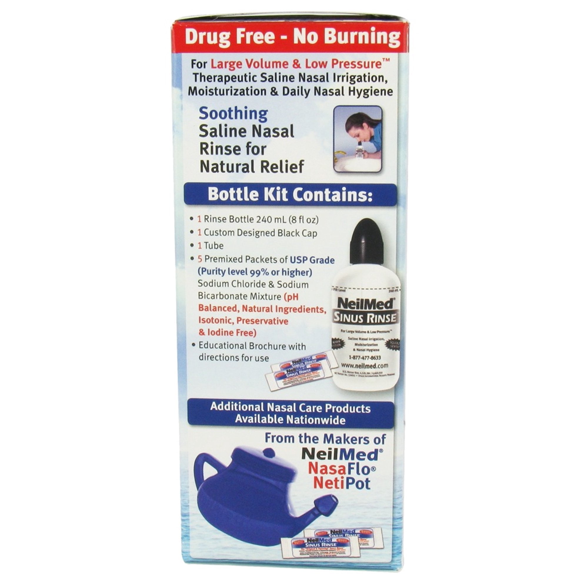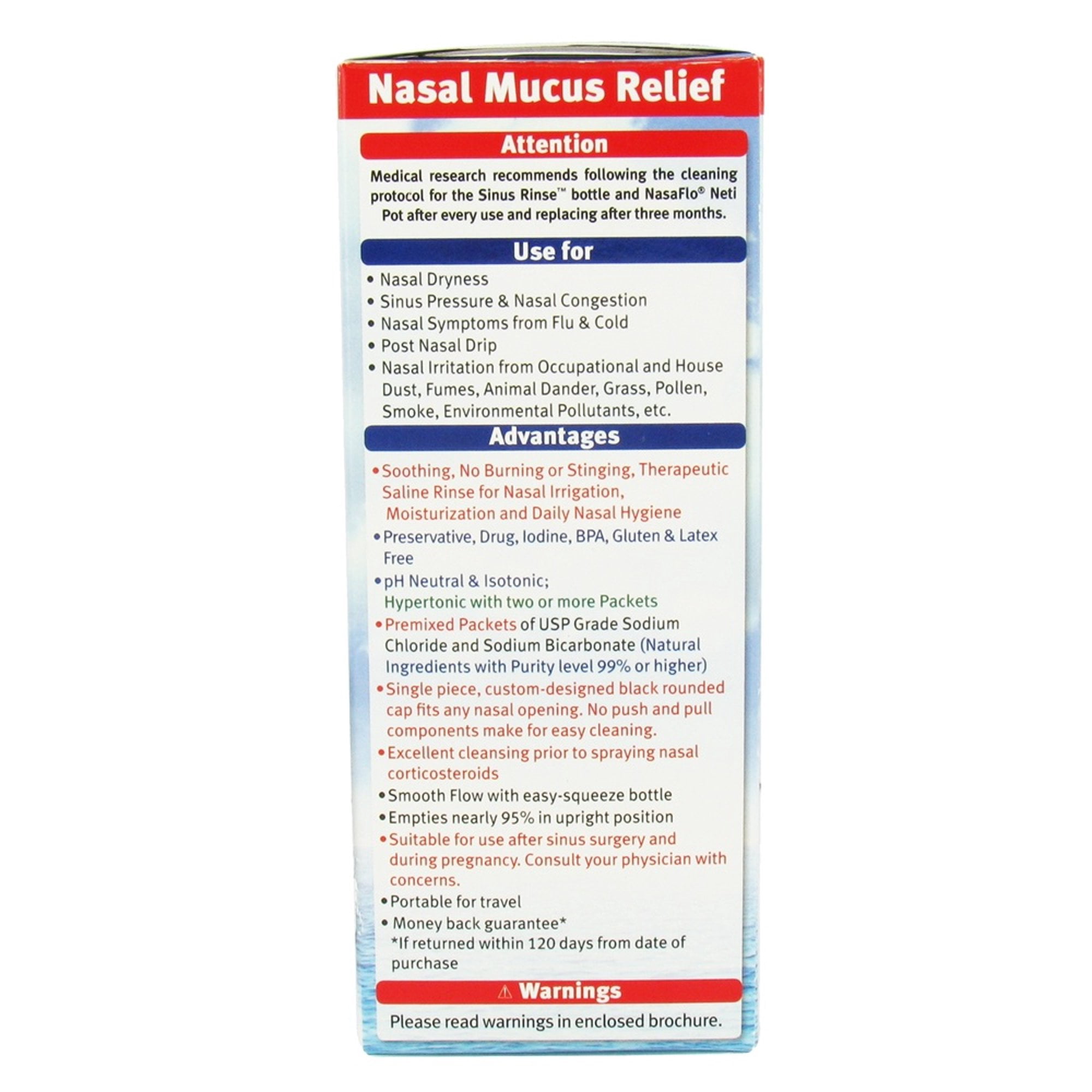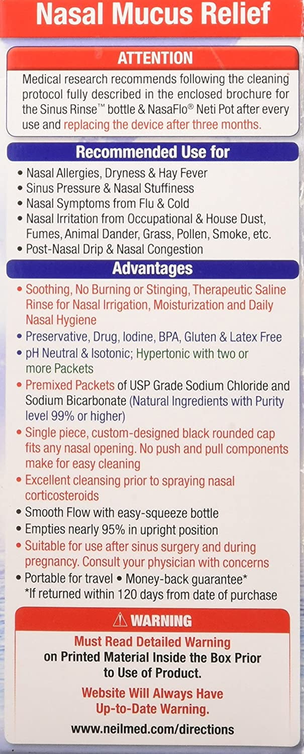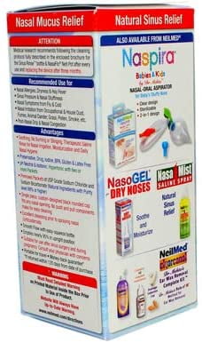 Use for: nasal dryness; sinus pressure and nasal congestion; nasal symptoms from flu and cold; post nasal drip; nasal irritation from occupational and house dust, fumes, animal dander, grass, pollen, smoke and environmental pollutants. Now soothing saline nasal rinse is as easy as 1 2 3. Make it an essential part of your daily hygiene – like brushing your teeth, washing your hands, or taking a shower. Soothing, no burning or stinging, therapeutic saline rinse for nasal irrigation, moisturization and daily nasal hygiene; preservative, drug, iodine, BPA, gluten and latex free; pH neutral and isotonic; hypertonic with two or more packets; premixed packets of USP grade sodium chloride and sodium bicarbonate (natural ingredients with purity level 99% or higher); single piece, custom-designed black rounded cap fits any nasal opening. No push or pull components make for easy cleaning; Excellent cleansing prior to spraying nasal corticosteroids; smooth flow with easy-squeeze bottle; empties nearly 95% in upright position; suitable for use after sinus surgery and during pregnancy. Consult your physician with concerns; portable to travel; money back guarantee (if returned within 120 days from date of purchase). Contains: 1 rinse bottle 240 mL (8 oz); 1 custom designed cap; 1 tube; 5 premixed packets of USP grade (purity level 99%or higher) sodium chloride and sodium bicarbonate mixture; Educational brochure; Directions for useUse for: nasal dryness; sinus pressure and nasal congestion; nasal symptoms from flu and cold; post nasal drip; nasal irritation from occupational and house dust, fumes, animal dander, grass, pollen, smoke and environmental pollutants. Now soothing saline nasal rinse is as easy as 1 2 3. Make it an