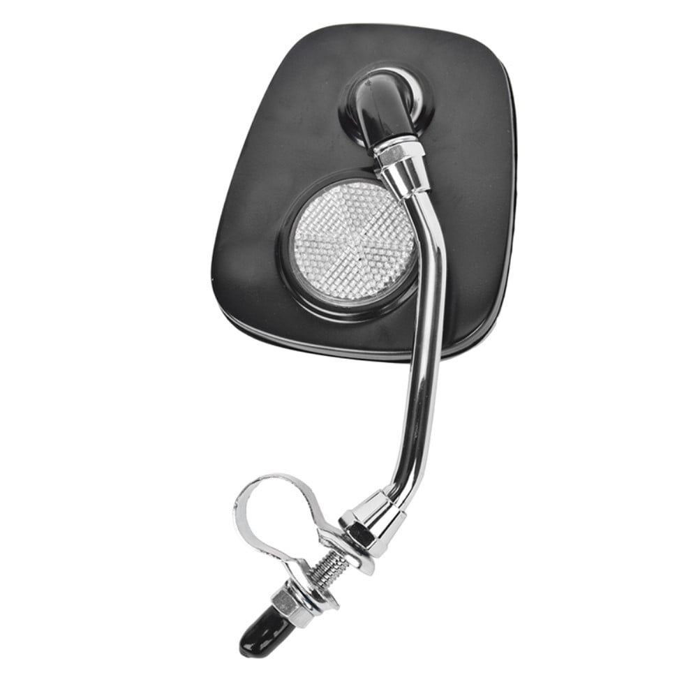Sunlite’s deluxe safety mirror for bicycle handlebars featuring a large rear viewing area, a White 1.5 in. circular reflector on the back for additional safety, and a 6 in. stem with built-in handlebar clamp. Made of steel with a Chrome finish for long lasting durability.