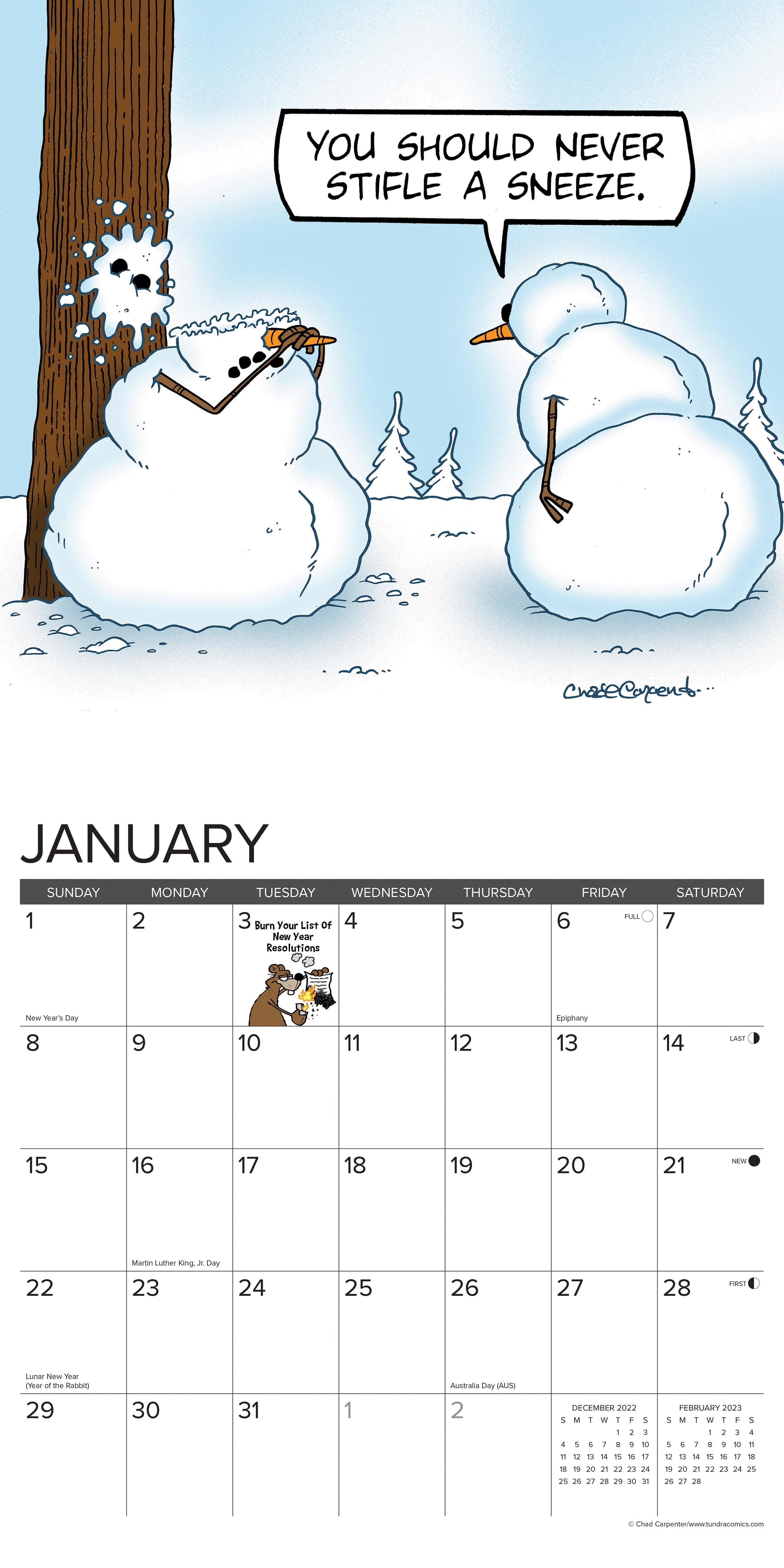 Tundra—the comic strip Mother Nature warned you about—is syndicated in nearly 500 newspapers throughout the U.S., Canada and Europe. Chad Carpenter chose 12 of his favorite full-color cartoons, “hand-picked for funniness,” featuring hilarious man vs. animal encounters in the Alaskan wilds. Printed with soy-based inks on FSC certified paper, this 12" x 12" wall calendar features large monthly grids that offer ample room for jotting notes, along with six bonus months of July through December of 2022. Also includes moon phases (CST), standard U.S. and international holidays.