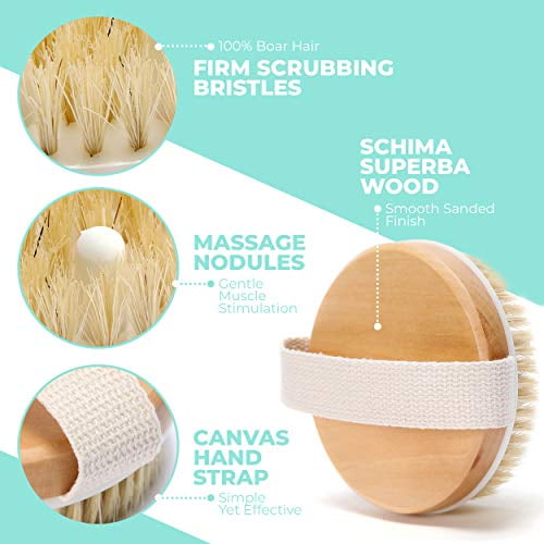 Dry Body Brush (100% Natural Bristle Brush), Reduce Cellulite – Dry Brush for Cellulite and Lymphatic Drainage, Exfoliating Brush With Soft Massage Nodules – Shower Brush Body Scrubber Skin Brush