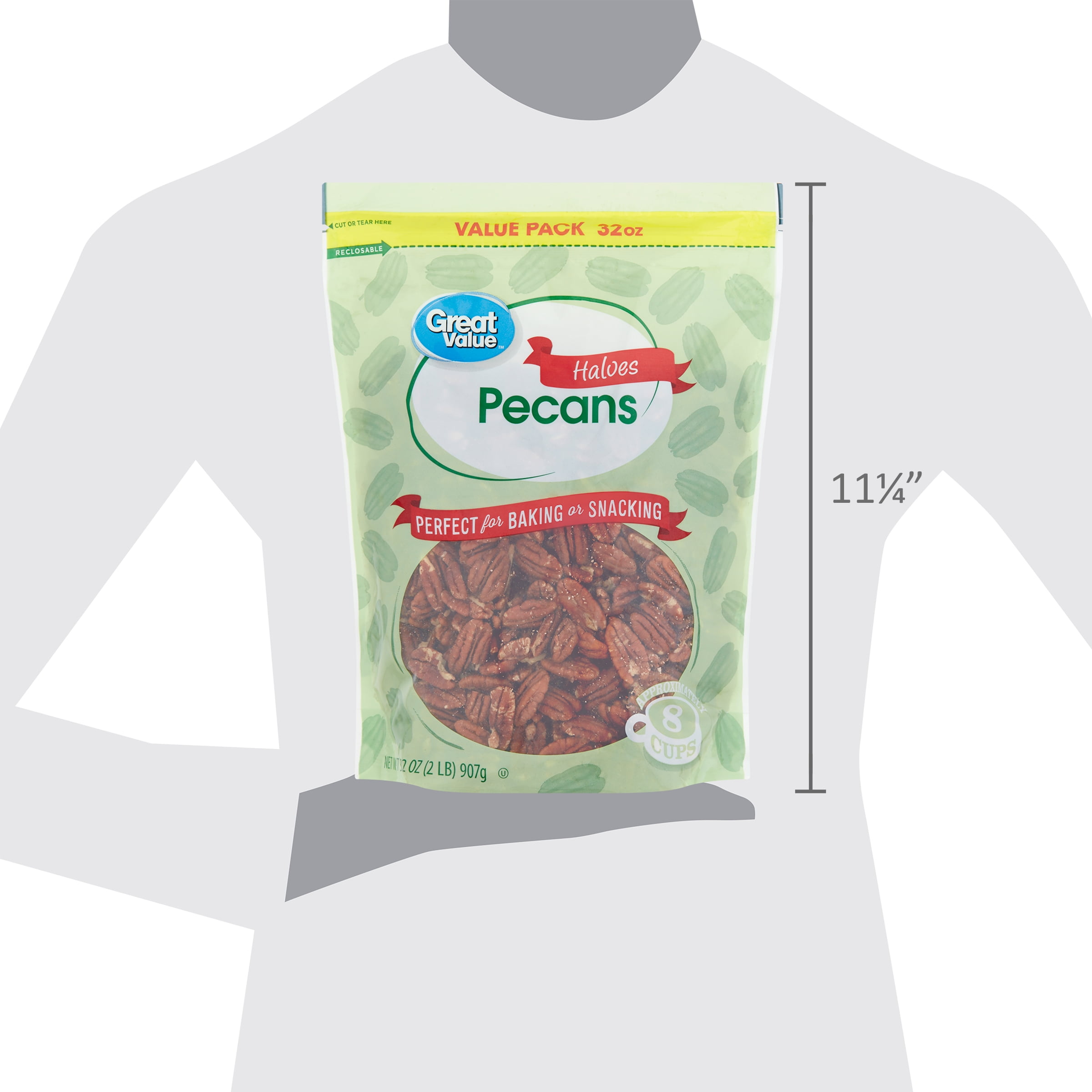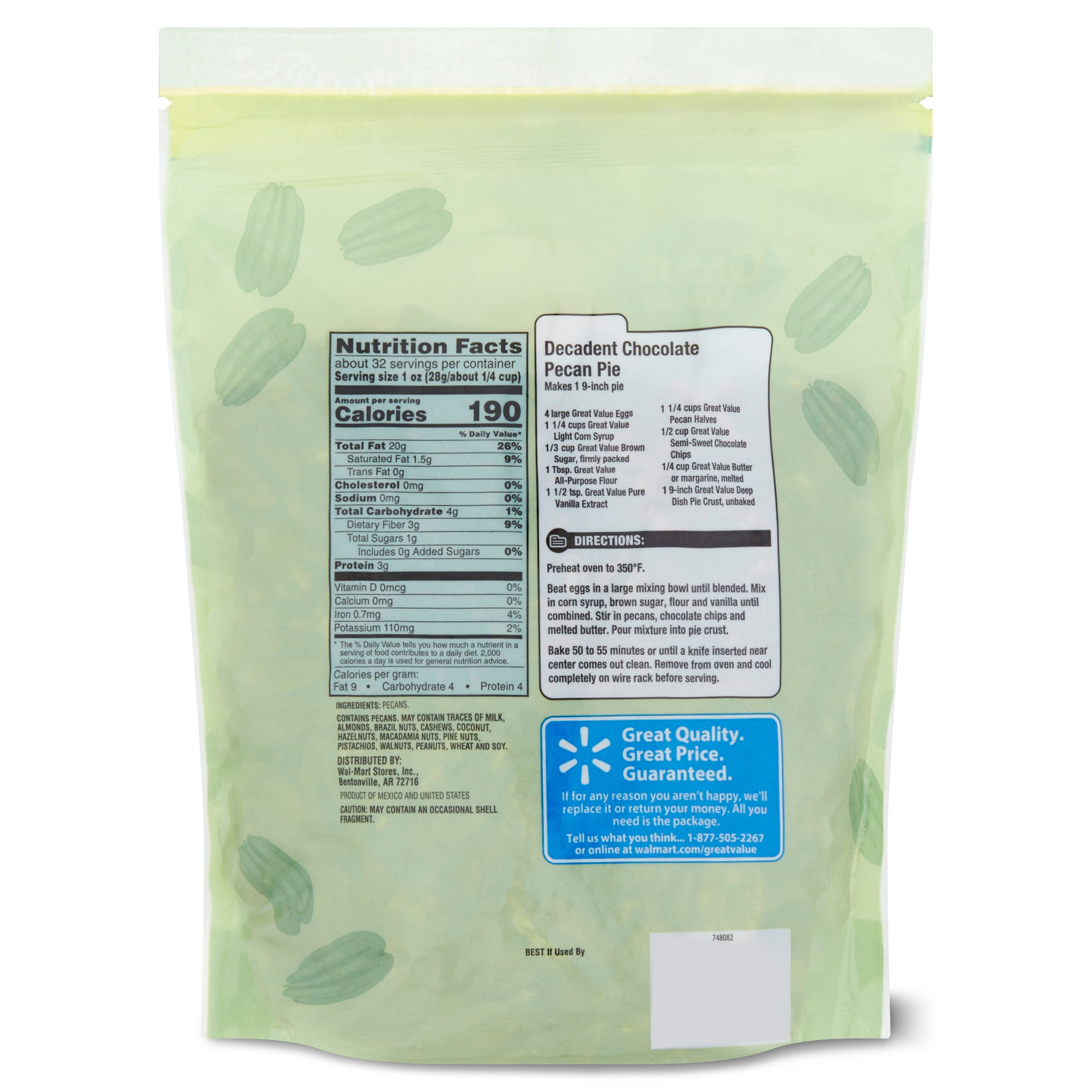 The perfect choice for adding texture and flavor to your home-baked goods is found in a bag of our Great Value Pecan Halves. These pecans add a satisfying crunch and delightfully nutty flavor to all your favorite desserts. Use them as a topping on pies, brownies and cakes, mix them with all your favorite nuts, candies and dried fruits to create a personalized trail mix, or you can even add them to salads for some delightful depth. Plus, we’ve even included our very own Caramel Pecan Pie recipe on the back of the packaging if you’re looking for some inspiration. Pecans offer a nutritional benefit as they are a good source of dietary fiber, and we’ve stored ours inside a resealable bag, making it easy to keep them fresh after every baking session. Add some crunch to your day with our Great Value Pecan Halves.